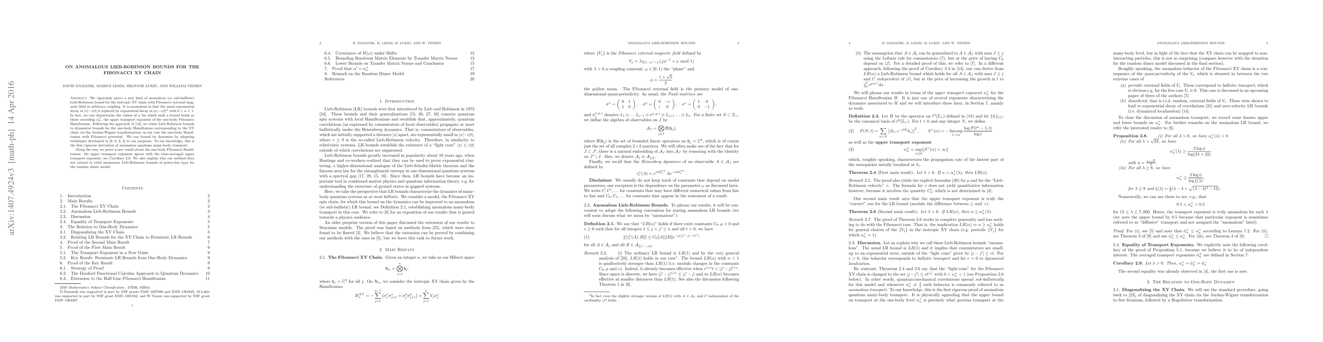 The paper introduces a novel approach to Lieb-Robinson bounds, incorporating the Fibonacci sequence and demonstrating sub-ballistic transport exponents in quantum spin chains.