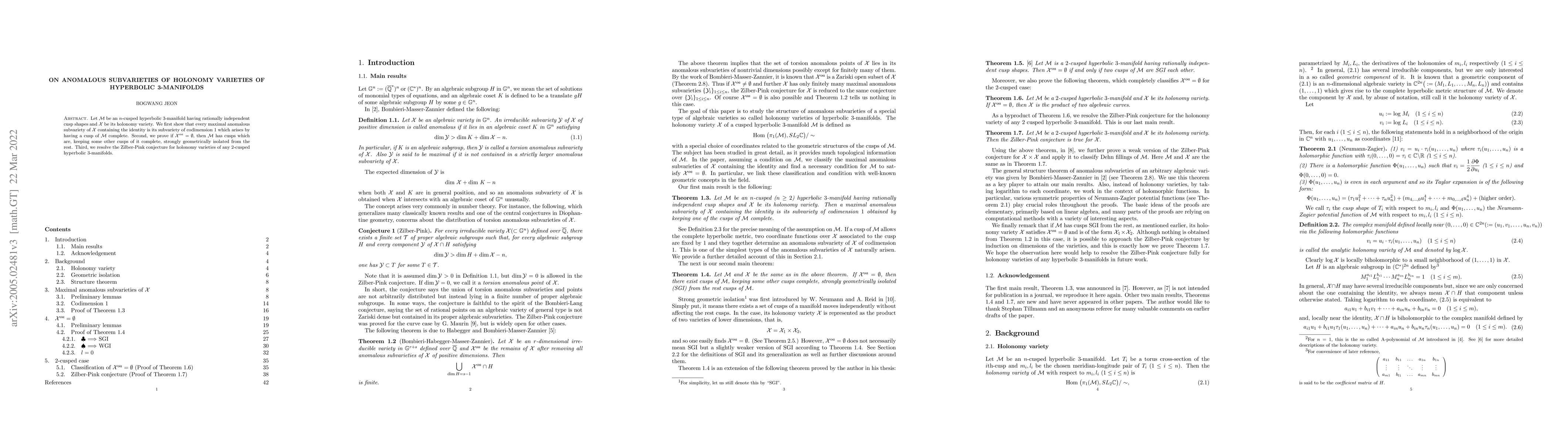 This paper investigates the structure of holonomy varieties of hyperbolic 3-manifolds, proving that maximal anomalous subvarieties of these varieties are of codimension 1 when a cusp is complete. It also resolves the Zilber-Pink conjecture for 2-cusped hyperbolic 3-manifolds.