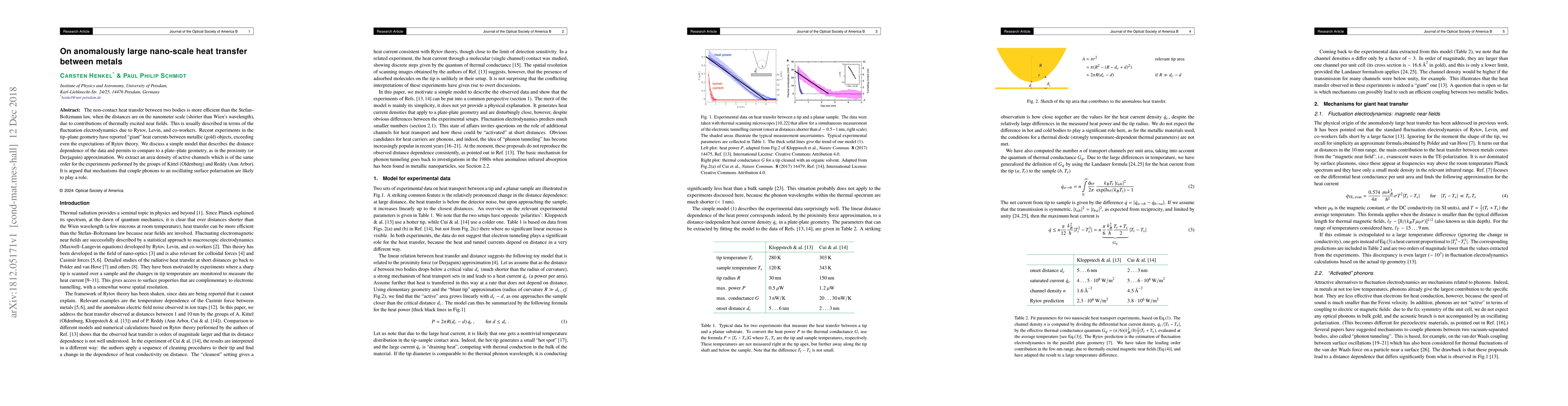The non-contact heat transfer between two bodies is more efficient than the Stefan-Boltzmann law, when the distances are on the nanometer scale (shorter than Wien's wavelength), due to contributions of thermally excited near fields. This is usually described in terms of the fluctuation electrodynamics due to Rytov, Levin, and co-workers. Recent experiments in the tip-plane geometry have reported "giant" heat currents between metallic (gold) objects, exceeding even the expectations of Rytov theory. We discuss a simple model that describes the distance dependence of the data and permits to compare to a plate-plate geometry, as in the proximity (or Derjaguin) approximation. We extract an area density of active channels which is of the same order for the experiments performed by the groups of Kittel (Oldenburg) and Reddy (Ann Arbor). It is argued that mechanisms that couple phonons to an oscillating surface polarisation are likely to play a role.