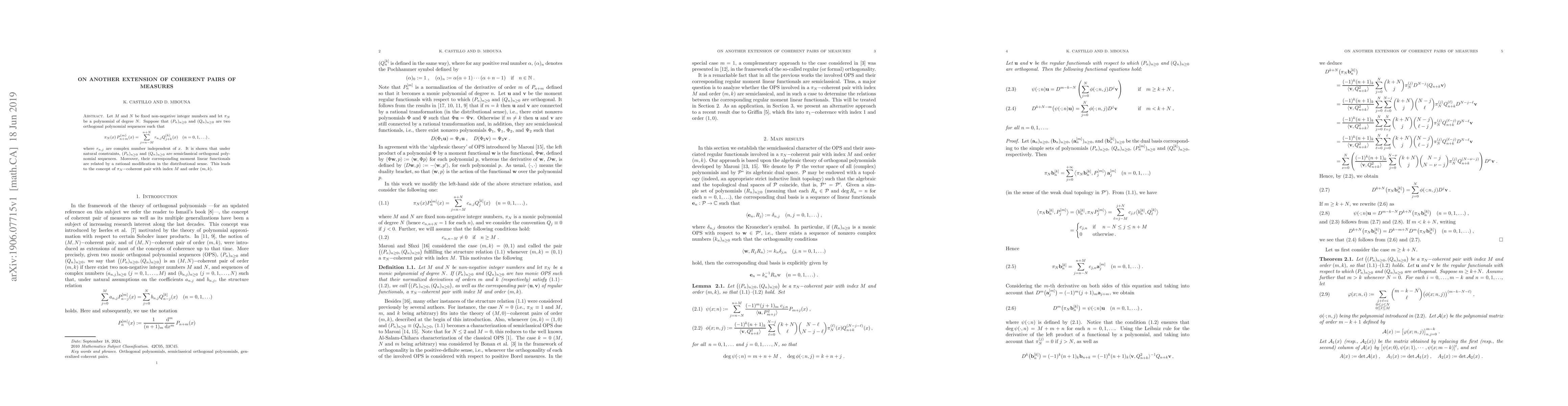 Let $M$ and $N$ be fixed non-negative integer numbers and let $\pi_N$ be a polynomial of degree $N$. Suppose that $(P_n)_{n\geq0}$ and $(Q_n)_{n\geq0}$ are two orthogonal polynomial sequences such that %their derivatives of orders $k$ and $m$ (respectively) satisfy the structure relation $$ \pi_N(x)\,P_{n+m}^{(m)}(x)= \sum_{j=n-M}^{n+N}r_{n,j}Q_{j+k}^{(k)}(x)\quad (n=0,1,\ldots)\,, $$ where $r_{n,j}$ are complex number independent of $x$. It is shown that under natural constraints, $(P_n)_{n\geq0}$ and $(Q_n)_{n\geq0}$ are semiclassical orthogonal polynomial sequences. Moreover, their corresponding moment linear functionals are related by a rational modification in the distributional sense. This leads to the concept of $\pi_N-$coherent pair with index $M$ and order $(m,k)$.