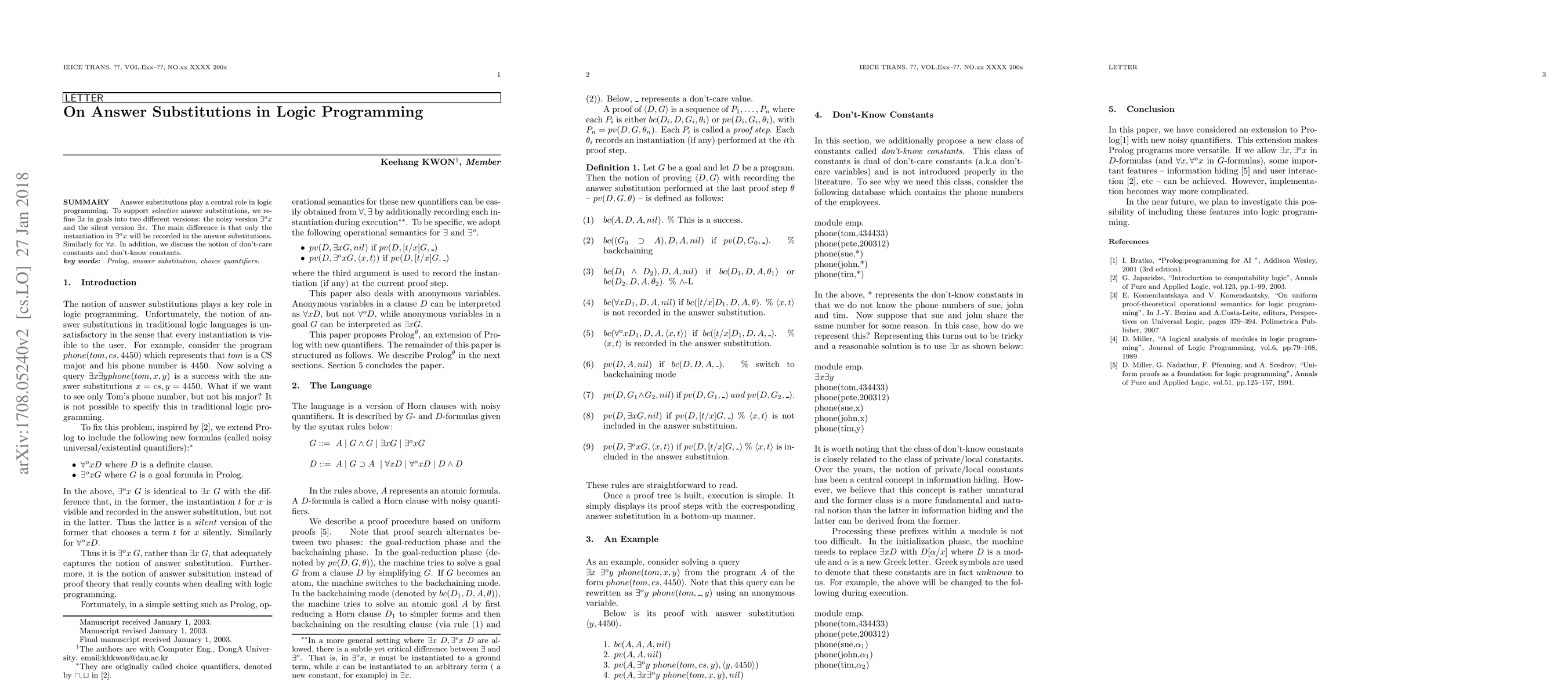 Answer substitutions play a central role in logic programming. To support {\it selective} answer substitutions, we refine $\exists x$ in goals into two different versions: the noisy version $\exists^o x$ and the silent version $\exists x$. The main difference is that only the instantiation in $\exists^o x$ will be recorded in the answer substitutions. Similarly for $\forall x$. In addition, we discuss the notion of don't-care constants and don't-know constants.