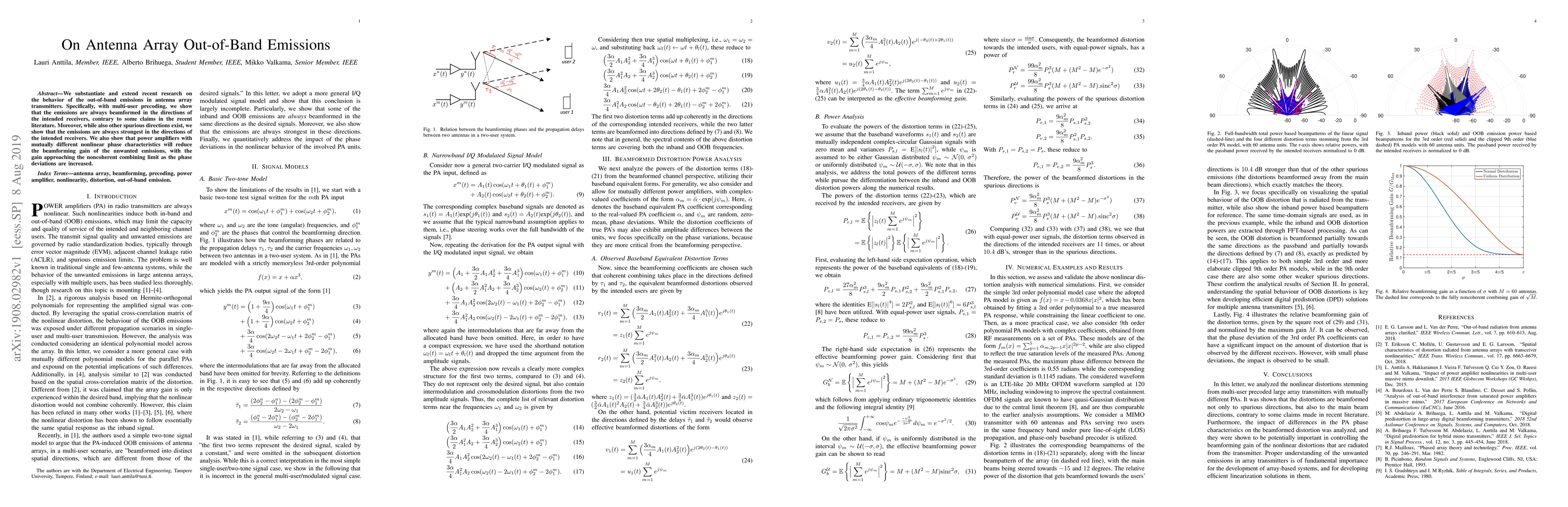 The paper validates that out-of-band emissions from antenna arrays, when using multi-user precoding, are always directed towards intended receivers, contradicting previous claims. It also demonstrates that power amplifiers with distinct nonlinear phase characteristics diminish the strength of these unwanted emissions, approaching a noncoherent combining limit with greater phase deviations.