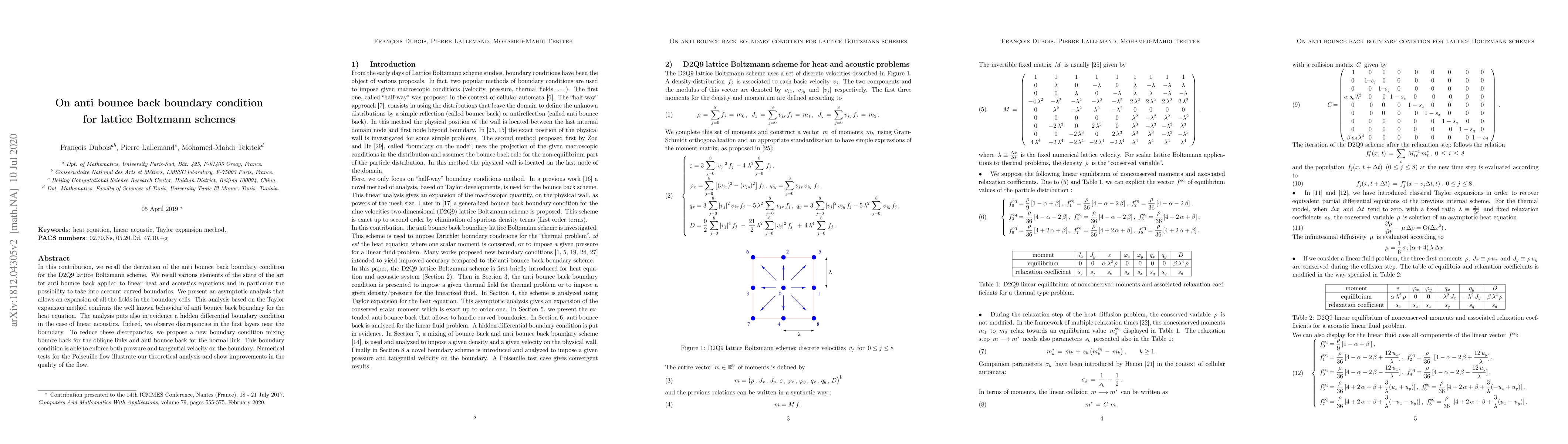 In this contribution, we recall the derivation of the anti bounce back boundary condition for the D2Q9 lattice Boltzmann scheme. We recall various elements of the state of the art for anti bounce back applied to linear heat and acoustics equations and in particular the possibility to take into account curved boundaries. We present an asymptotic analysis that allows an expansion of all the fields in the boundary cells. This analysis based on the Taylor expansion method confirms the well known behaviour of anti bounce back boundary for the heat equation. The analysis puts also in evidence a hidden differential boundary condition in the case of linear acoustics. Indeed, we observe discrepancies in the first layers near the boundary. To reduce these discrepancies, we propose a new boundary condition mixing bounce back for the oblique links and anti bounce back for the normal link. This boundary condition is able to enforce both pressure and tangential velocity on the boundary. Numerical tests for the Poiseuille flow illustrate our theoretical analysis and show improvements in the quality of the flow.