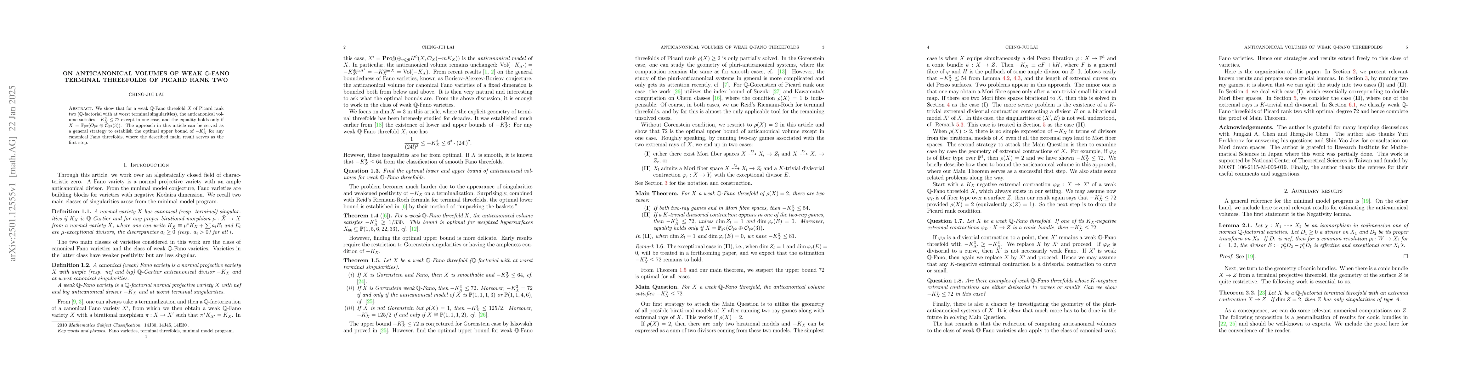 This paper establishes that the anticanonical volume of a weak $\mathbb{Q}$-Fano threefold with Picard rank two is at most 72, except for the specific case where it equals 72 and the threefold is isomorphic to $\mathbb{P}(\mathcal{O}_{\mathbb{P}^2}\oplus\mathcal{O}_{\mathbb{P}^2}(3))$. The methodology presented could be extended to find optimal bounds for other canonical Fano threefolds.
