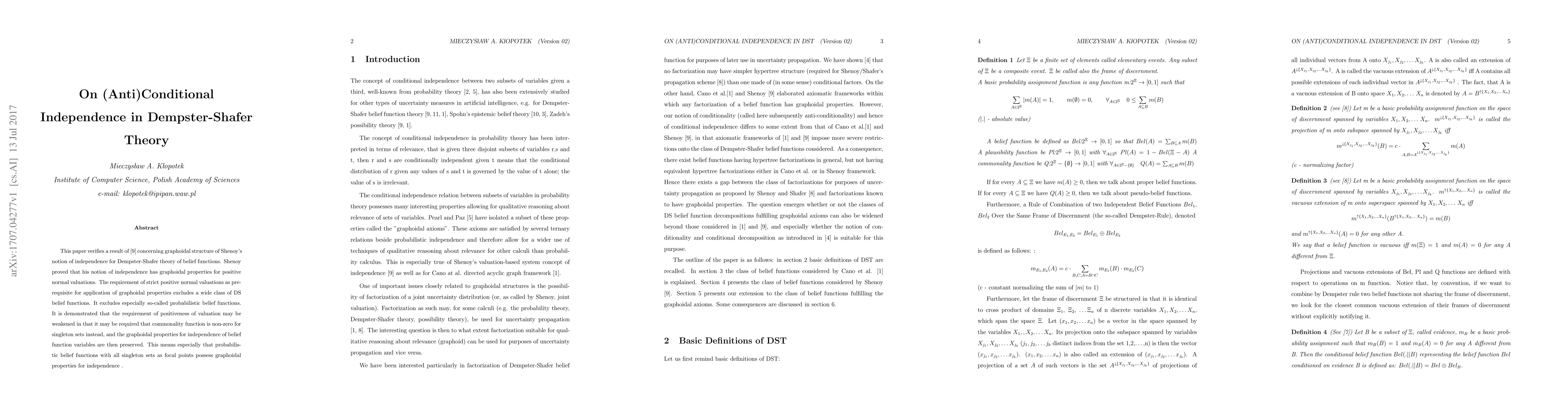 This paper verifies a result of {Shenoy:94} concerning graphoidal structure of Shenoy's notion of independence for Dempster-Shafer theory of belief functions. Shenoy proved that his notion of independence has graphoidal properties for positive normal valuations. The requirement of strict positive normal valuations as prerequisite for application of graphoidal properties excludes a wide class of DS belief functions. It excludes especially so-called probabilistic belief functions. It is demonstrated that the requirement of positiveness of valuation may be weakened in that it may be required that commonality function is non-zero for singleton sets instead, and the graphoidal properties for independence of belief function variables are then preserved. This means especially that probabilistic belief functions with all singleton sets as focal points possess graphoidal properties for independence.