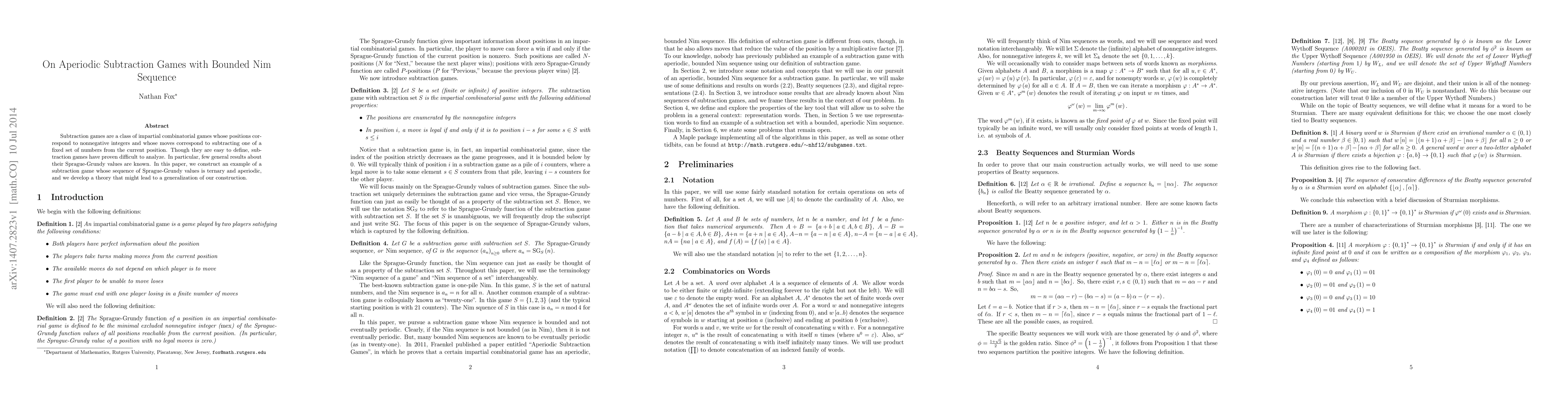 This paper constructs an example of a ternary and aperiodic subtraction game with bounded Nim sequence and develops a theoretical framework that may generalize this construction for further analysis of such games.