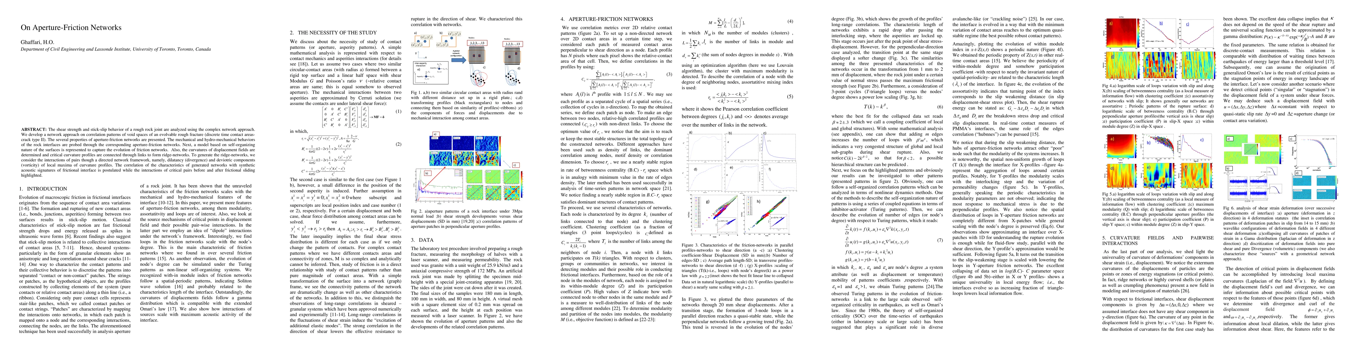 A model based on self-organizing nature of the surfaces is represented to capture the evolution of friction networks. Also, the curvatures of displacement fields are determined and critical curvature profiles are connected through links to form ridge-networks. To generate the ridge-networks, we consider the interactions of pairs though a directed network framework, namely, dilatancy (divergence) and deviotric components (vorticity) of local maxima of curvature profiles. The correlation of the characteristics of generated networks with synthetic acoustic signatures of frictional interface is postulated while the interactions of critical pairs before and after frictional sliding highlighted.