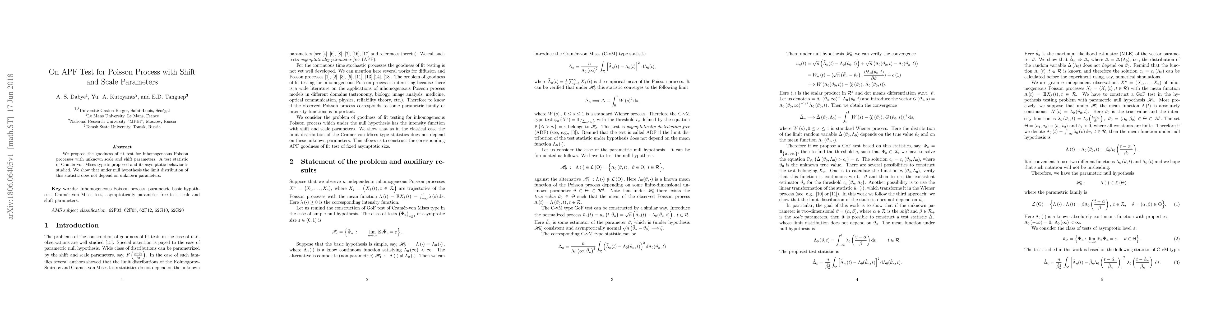 Summary: This paper proposes a Cramer-von Mises type goodness of fit test for inhomogeneous Poisson processes with unknown scale and shift parameters, demonstrating that the test statistic's asymptotic behavior is independent of these parameters under the null hypothesis.