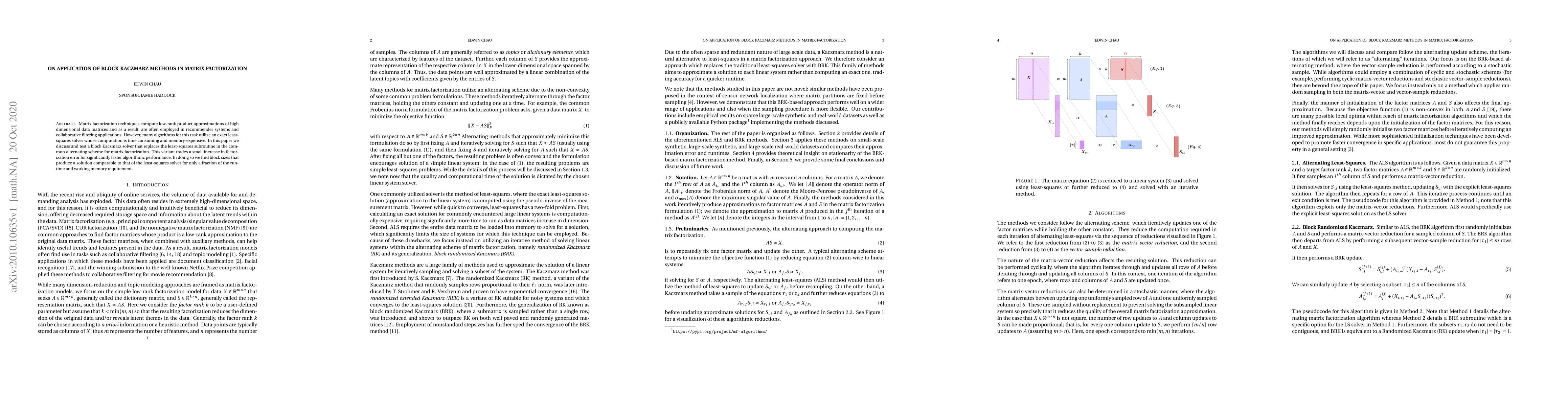 Matrix factorization techniques compute low-rank product approximations of high dimensional data matrices and as a result, are often employed in recommender systems and collaborative filtering applications. However, many algorithms for this task utilize an exact least-squares solver whose computation is time consuming and memory-expensive. In this paper we discuss and test a block Kaczmarz solver that replaces the least-squares subroutine in the common alternating scheme for matrix factorization. This variant trades a small increase in factorization error for significantly faster algorithmic performance. In doing so we find block sizes that produce a solution comparable to that of the least-squares solver for only a fraction of the runtime and working memory requirement.