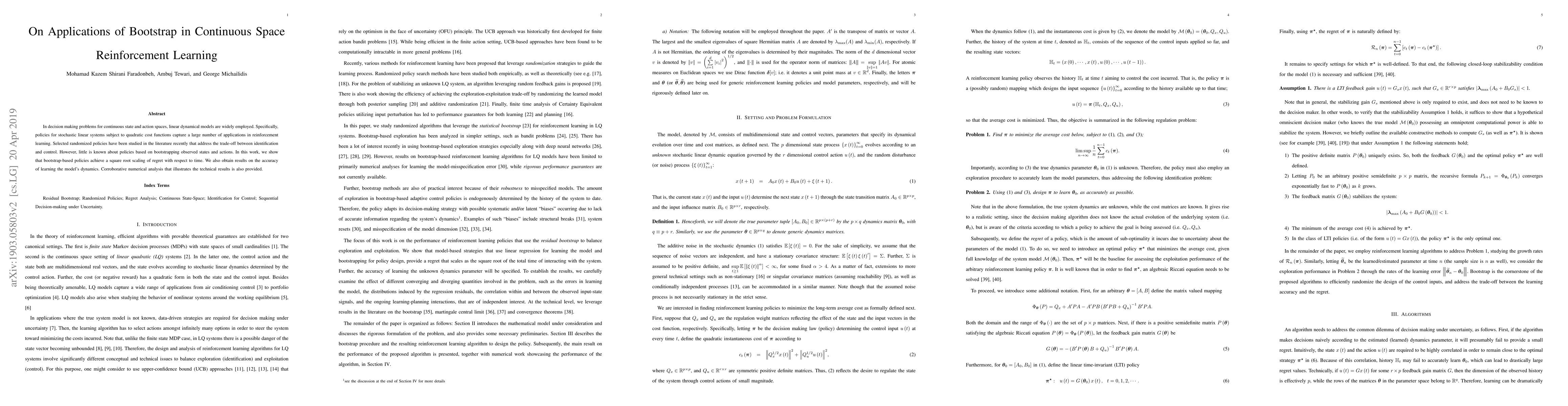 This paper explores the application of bootstrapping in continuous space reinforcement learning, demonstrating that bootstrap-based policies achieve a square root scaling of regret over time and providing numerical analysis to support the theoretical findings. It also discusses the accuracy of learning the model's dynamics through bootstrapping observed states and actions.