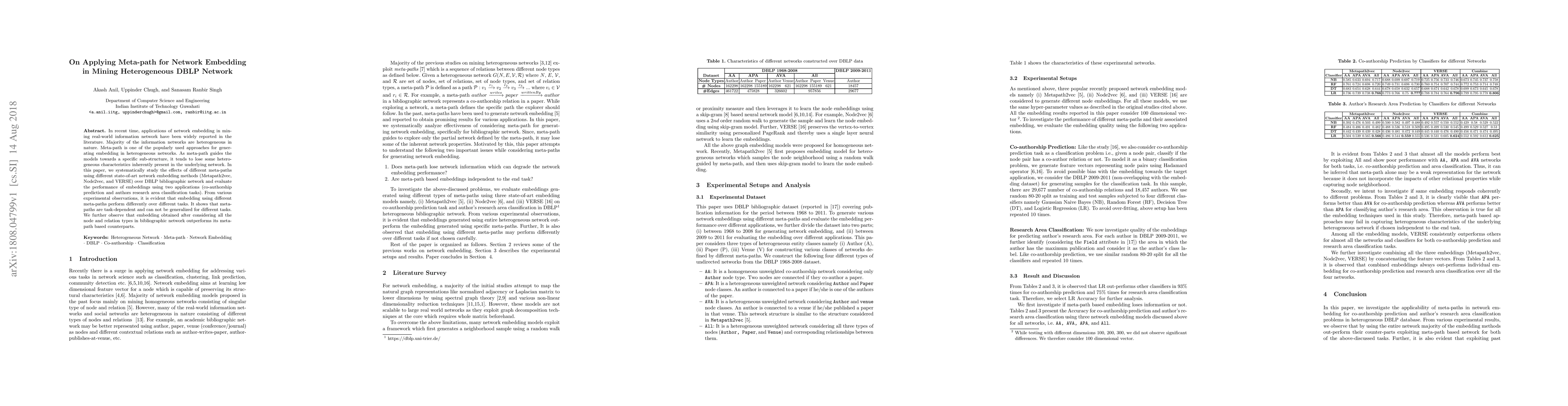 This paper investigates the impact of various meta-paths on network embedding performance in heterogeneous DBLP networks using state-of-the-art methods. Results show that meta-path-based embeddings are task-dependent and outperform specific meta-path embeddings when all node and relation types are considered.