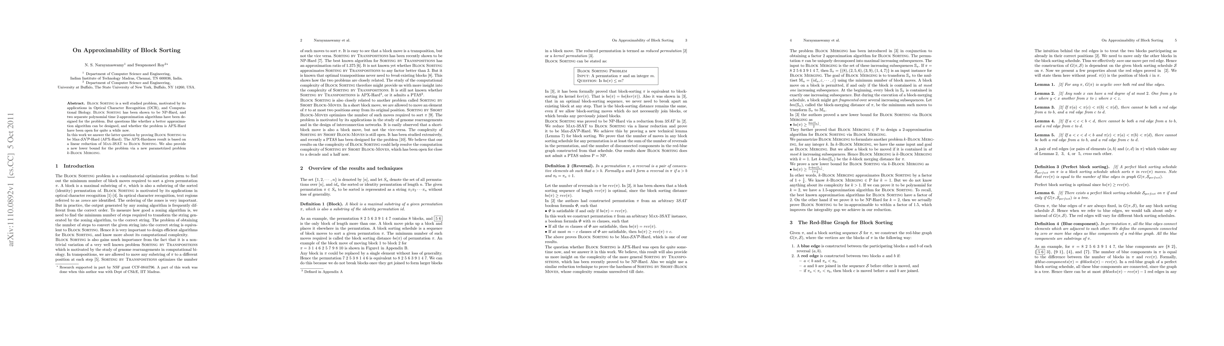 Block Sorting is a well studied problem, motivated by its applications in Optical Character Recognition (OCR), and Computational Biology. Block Sorting has been shown to be NP-Hard, and two separate polynomial time 2-approximation algorithms have been designed for the problem. But questions like whether a better approximation algorithm can be designed, and whether the problem is APX-Hard have been open for quite a while now. In this work we answer the latter question by proving Block Sorting to be Max-SNP-Hard (APX-Hard). The APX-Hardness result is based on a linear reduction of Max-3SAT to Block Sorting. We also provide a new lower bound for the problem via a new parametrized problem k-Block Merging.