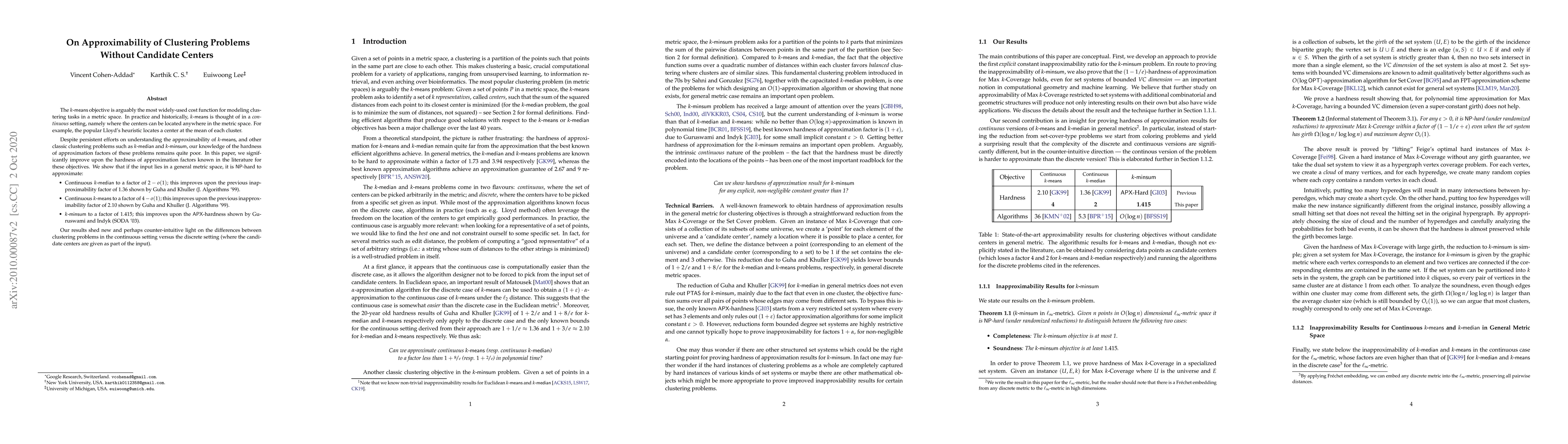 The paper improves upon known hardness of approximation factors for clustering problems in a continuous metric space, showing that k-median can be approximated within a 2-o(1) factor, k-means within a 4- o(1) factor, and k-minsum with an APX-hardness improvement.