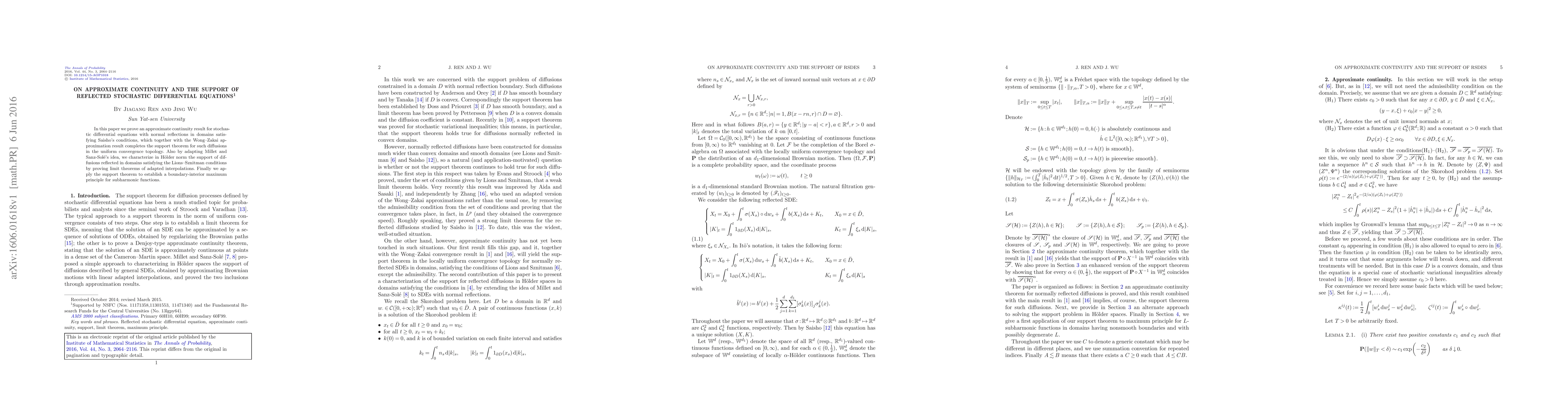 In this paper we prove an approximate continuity result for stochastic differential equations with normal reflections in domains satisfying Saisho's conditions, which together with the Wong-Zakai approximation result completes the support theorem for such diffusions in the uniform convergence topology. Also by adapting Millet and Sanz-Sol\'{e}'s idea, we characterize in H\"{o}lder norm the support of diffusions reflected in domains satisfying the Lions-Sznitman conditions by proving limit theorems of adapted interpolations. Finally we apply the support theorem to establish a boundary-interior maximum principle for subharmonic functions.