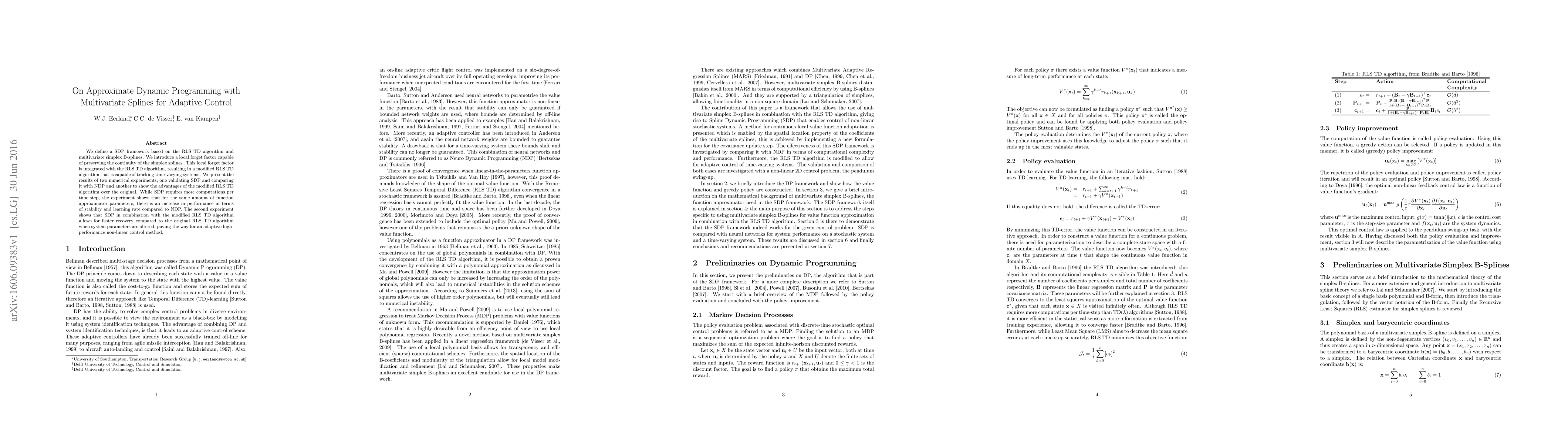 We define a SDP framework based on the RLSTD algorithm and multivariate simplex B-splines. We introduce a local forget factor capable of preserving the continuity of the simplex splines. This local forget factor is integrated with the RLSTD algorithm, resulting in a modified RLSTD algorithm that is capable of tracking time-varying systems. We present the results of two numerical experiments, one validating SDP and comparing it with NDP and another to show the advantages of the modified RLSTD algorithm over the original. While SDP requires more computations per time-step, the experiment shows that for the same amount of function approximator parameters, there is an increase in performance in terms of stability and learning rate compared to NDP. The second experiment shows that SDP in combination with the modified RLSTD algorithm allows for faster recovery compared to the original RLSTD algorithm when system parameters are altered, paving the way for an adaptive high-performance non-linear control method.