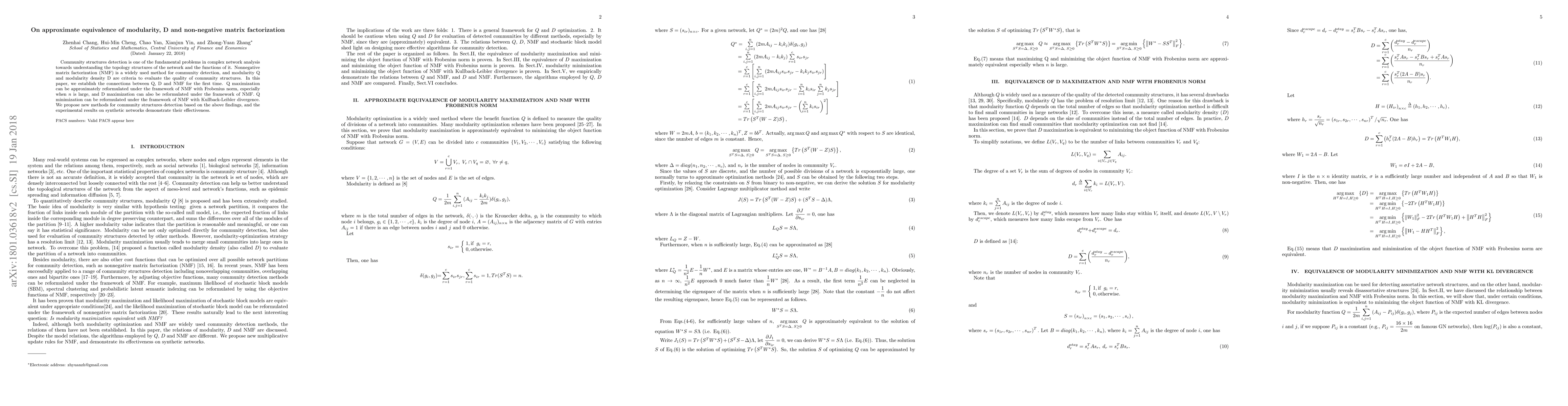 Community structures detection is one of the fundamental problems in complex network analysis towards understanding the topology structures of the network and the functions of it. Nonnegative matrix factorization (NMF) is a widely used method for community detection, and modularity Q and modularity density D are criteria to evaluate the quality of community structures. In this paper, we establish the connections between Q, D and NMF for the first time. Q maximization can be approximately reformulated under the framework of NMF with Frobenius norm, especially when $n$ is large, and D maximization can also be reformulated under the framework of NMF. Q minimization can be reformulated under the framework of NMF with Kullback-Leibler divergence. We propose new methods for community structures detection based on the above findings, and the experimental results on synthetic networks demonstrate their effectiveness.
