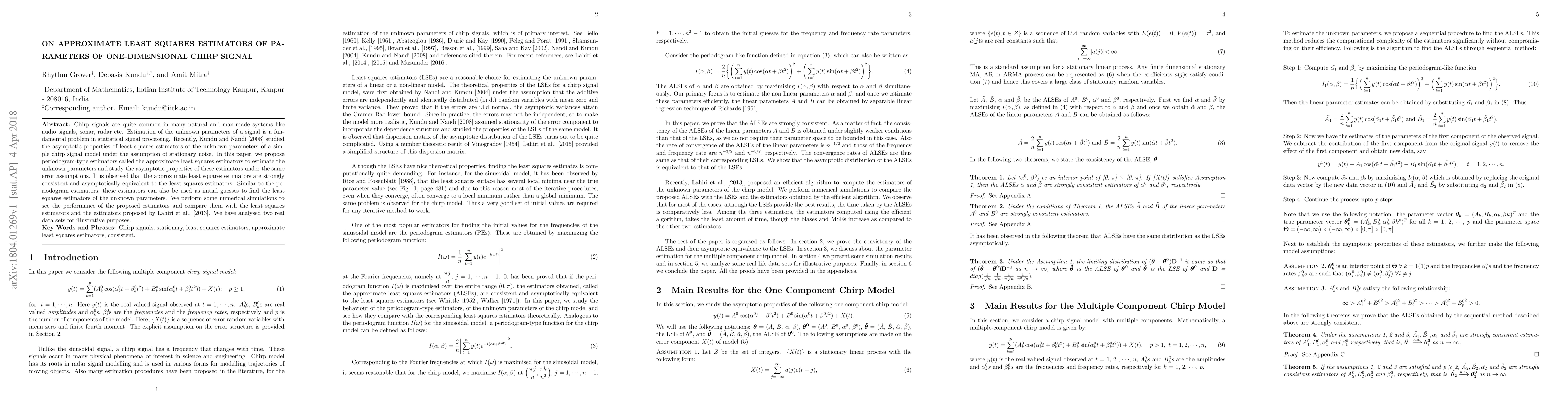 This paper proposes approximate least squares estimators for the parameters of one-dimensional chirp signals, demonstrating their strong consistency and asymptotic equivalence to traditional least squares estimators. Numerical simulations and real data analyses show the practical performance of these new estimators.