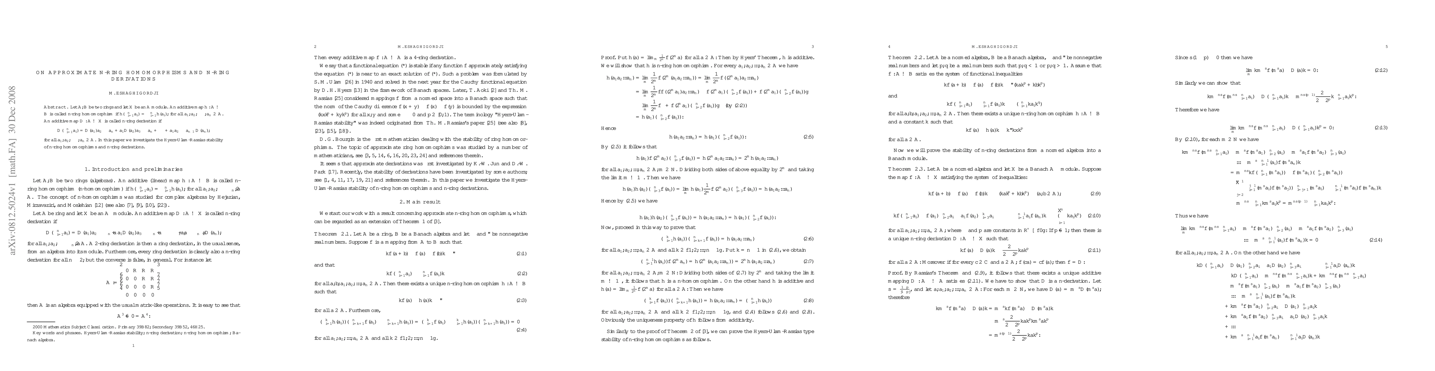 Let $A,B$ be two rings and let $ X$ be an $ A-$module. An additive map $h: A\to B$ is called n-ring homomorphism if $h(\Pi^n_{i=1}a_i)=\Pi^n_{i=1}h(a_i),$ for all $a_1,a_2, ...,a_n \in {A}$. An additive map $D: A\to X$ is called $n$-ring derivation if $$D(\Pi^n_{i=1}a_i)=D(a_1)a_2... a_n+a_1D(a_2)a_3... a_n+... +a_1a_2... a_{n-1}D(a_n),$$ for all $a_1,a_2, ...,a_n \in {\mathcal A}$. In this paper we investigate the Hyers-Ulam-Rassias stability of $n$-ring homomorphisms and n-ring derivations.
