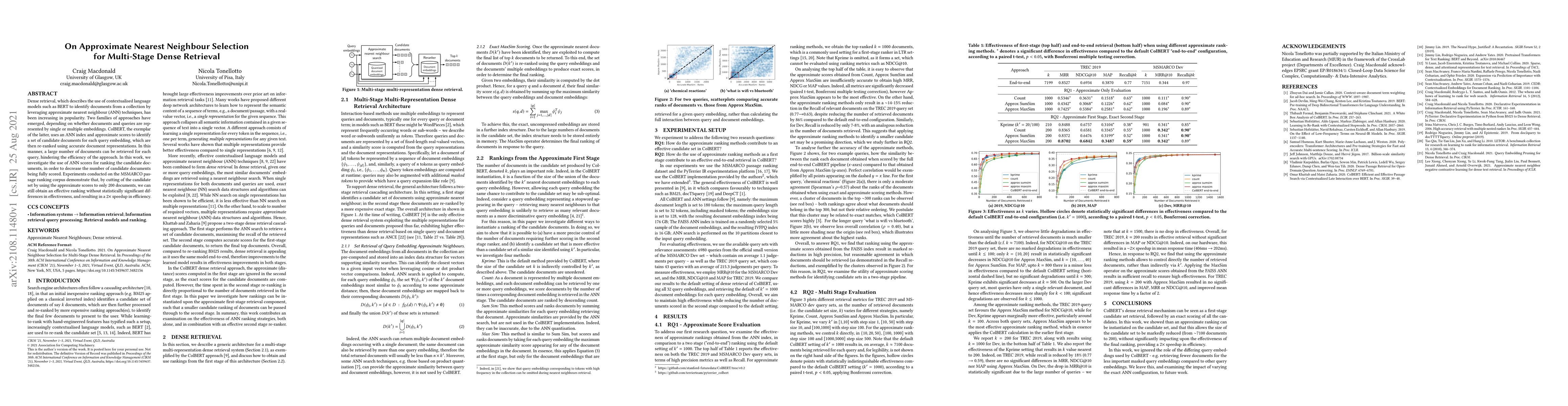 Dense retrieval, which describes the use of contextualised language models such as BERT to identify documents from a collection by leveraging approximate nearest neighbour (ANN) techniques, has been increasing in popularity. Two families of approaches have emerged, depending on whether documents and queries are represented by single or multiple embeddings. ColBERT, the exemplar of the latter, uses an ANN index and approximate scores to identify a set of candidate documents for each query embedding, which are then re-ranked using accurate document representations. In this manner, a large number of documents can be retrieved for each query, hindering the efficiency of the approach. In this work, we investigate the use of ANN scores for ranking the candidate documents, in order to decrease the number of candidate documents being fully scored. Experiments conducted on the MSMARCO passage ranking corpus demonstrate that, by cutting of the candidate set by using the approximate scores to only 200 documents, we can still obtain an effective ranking without statistically significant differences in effectiveness, and resulting in a 2x speedup in efficiency.