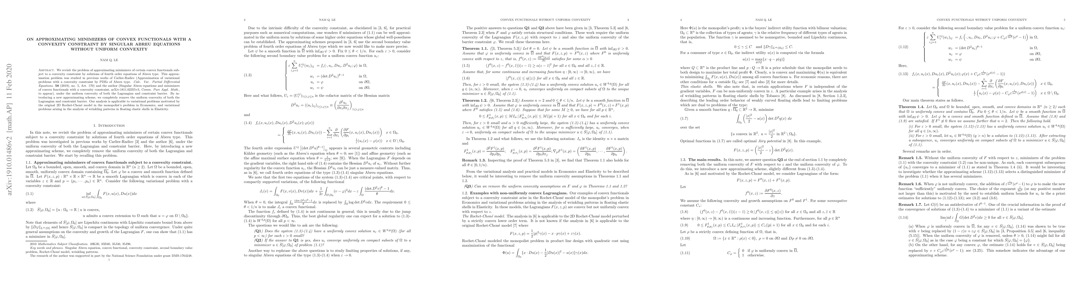 This paper proposes a new approximation scheme to estimate minimizers of convex functionals with a convexity constraint using fourth-order Abreu equations, eliminating the requirement for uniform convexity of both the Lagrangian and constraint barrier. This advancement extends the applicability to economic and elasticity models.