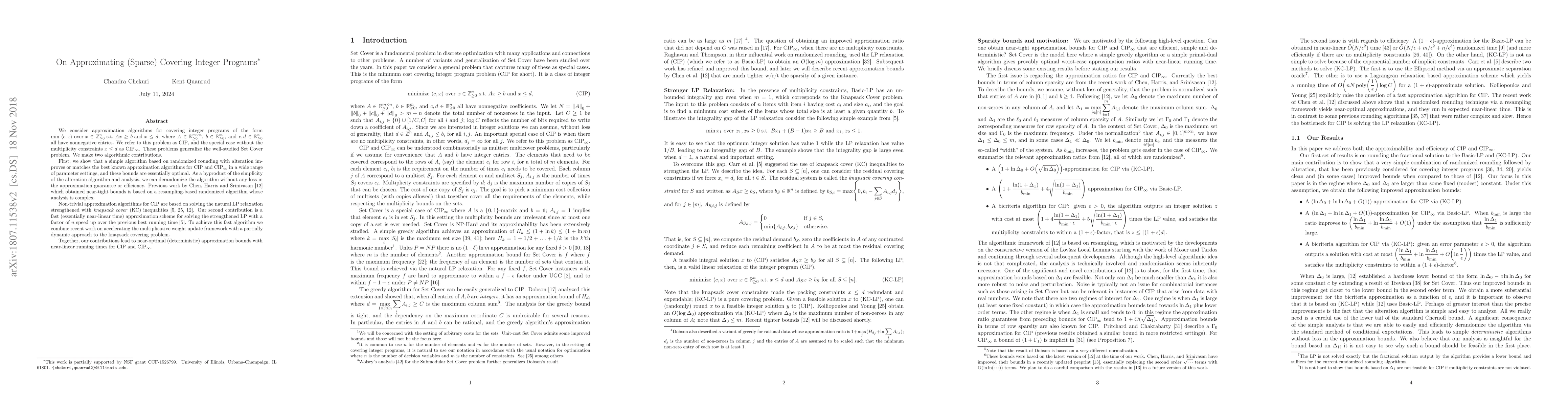 We consider approximation algorithms for covering integer programs of the form min $\langle c, x \rangle $ over $x \in \mathbb{N}^n $ subject to $A x \geq b $ and $x \leq d$; where $A \in \mathbb{R}_{\geq 0}^{m \times n}$, $b \in \mathbb{R}_{\geq 0}^m$, and $c, d \in \mathbb{R}_{\geq 0}^n$ all have nonnegative entries. We refer to this problem as $\operatorname{CIP}$, and the special case without the multiplicity constraints $x \le d$ as $\operatorname{CIP}_{\infty}$. These problems generalize the well-studied Set Cover problem. We make two algorithmic contributions. First, we show that a simple algorithm based on randomized rounding with alteration improves or matches the best known approximation algorithms for $\operatorname{CIP}$ and $\operatorname{CIP}_{\infty}$ in a wide range of parameter settings, and these bounds are essentially optimal. As a byproduct of the simplicity of the alteration algorithm and analysis, we can derandomize the algorithm without any loss in the approximation guarantee or efficiency. Previous work by Chen, Harris and Srinivasan [12] which obtained near-tight bounds is based on a resampling-based randomized algorithm whose analysis is complex. Non-trivial approximation algorithms for $\operatorname{CIP}$ are based on solving the natural LP relaxation strengthened with knapsack cover (KC) inequalities [5,24,12]. Our second contribution is a fast (essentially near-linear time) approximation scheme for solving the strengthened LP with a factor of $n$ speed up over the previous best running time [5]. Together, our contributions lead to near-optimal (deterministic) approximation bounds with near-linear running times for $\operatorname{CIP}$ and $\operatorname{CIP}_{\infty}$.