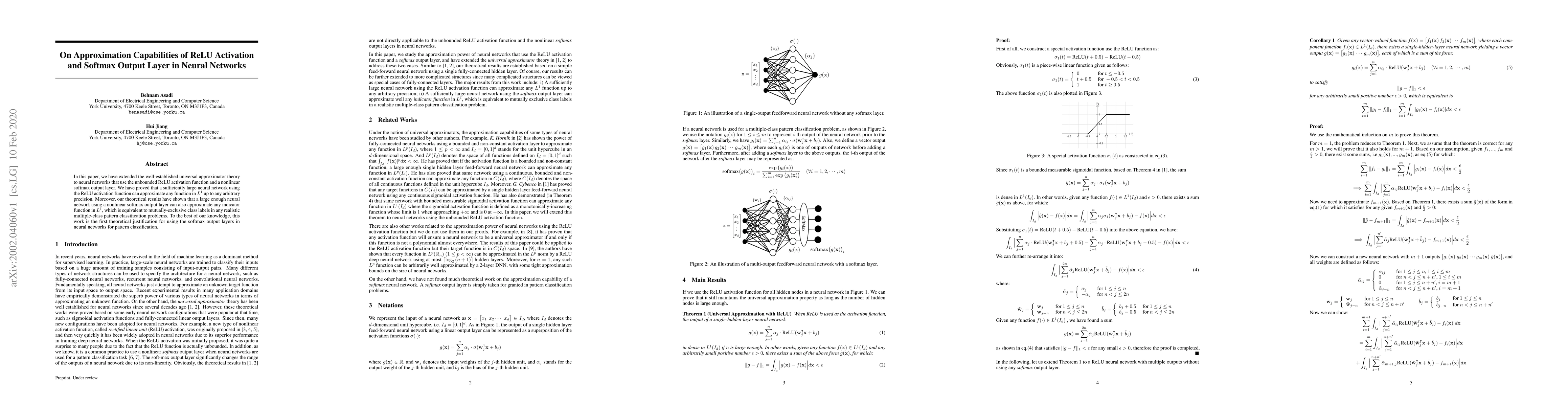 This paper proves that neural networks with ReLU activation functions and softmax output layers can approximate any function in $L^1$ and any indicator function, respectively, with arbitrary precision, providing the first theoretical justification for using softmax layers in pattern classification.