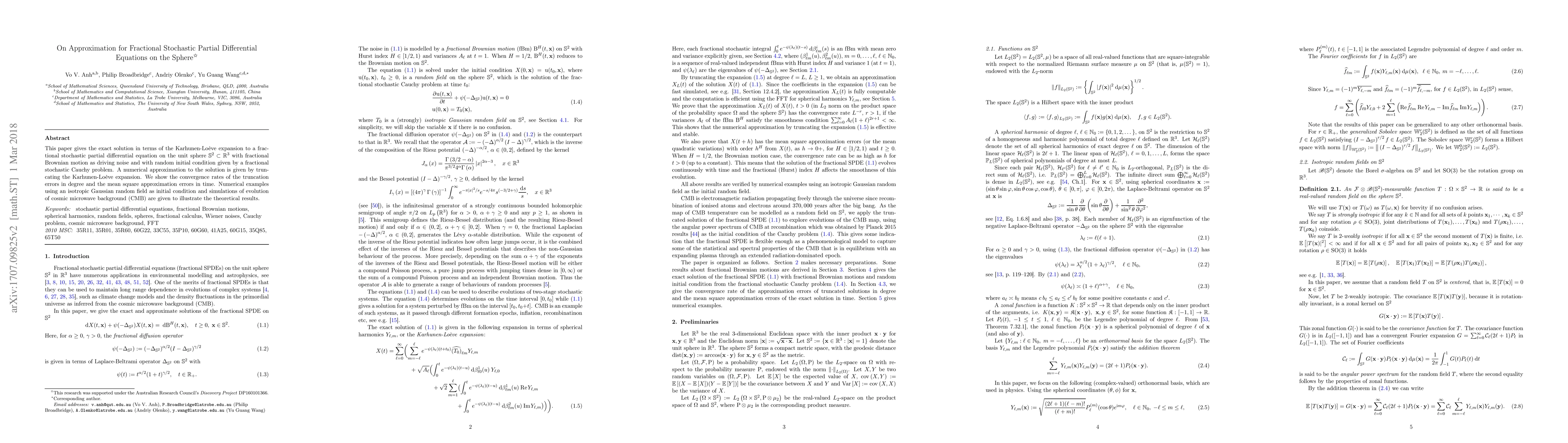 This paper presents the exact solution for a fractional stochastic partial differential equation on the unit sphere using a Karhunen-Loève expansion, and provides a numerical approximation by truncating this expansion. It also demonstrates convergence rates for truncation and mean square approximation errors, supplemented by numerical examples and simulations of cosmic microwave background evolution.