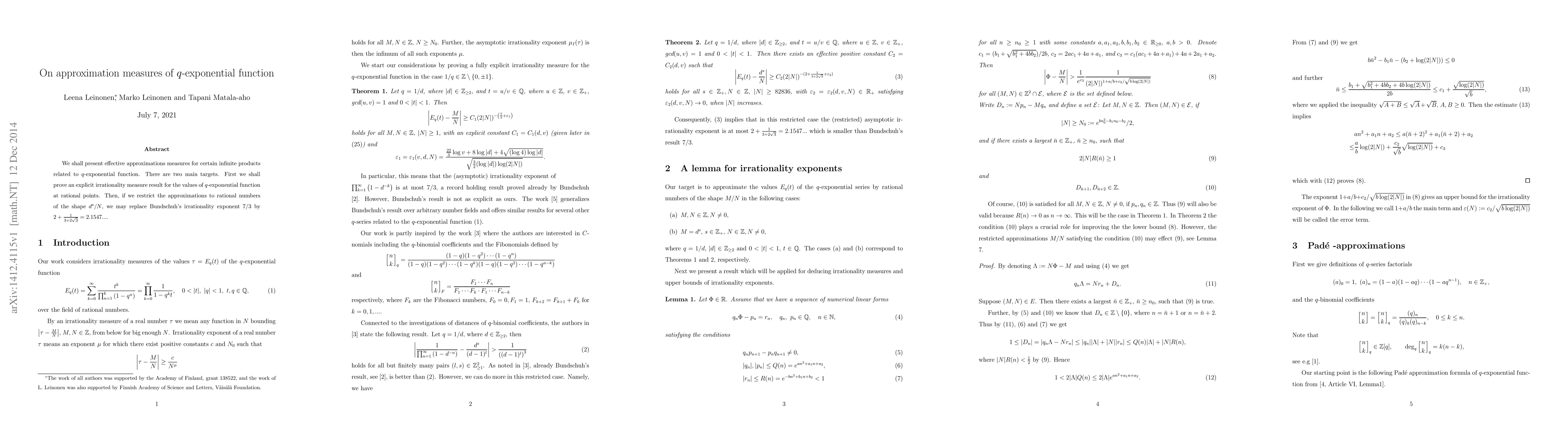 We shall present effective approximations measures for certain infinite products related to $q$-exponential function. There are two main targets. First we shall prove an explicit irrationality measure result for the values of $q$-exponential function at rational points. Then, if we restrict the approximations to rational numbers of the shape $d^s/N$, we may replace Bundschuh's irrationality exponent $7/3$ by $2+\frac{1}{3+2\sqrt 3}=2.1547...$.