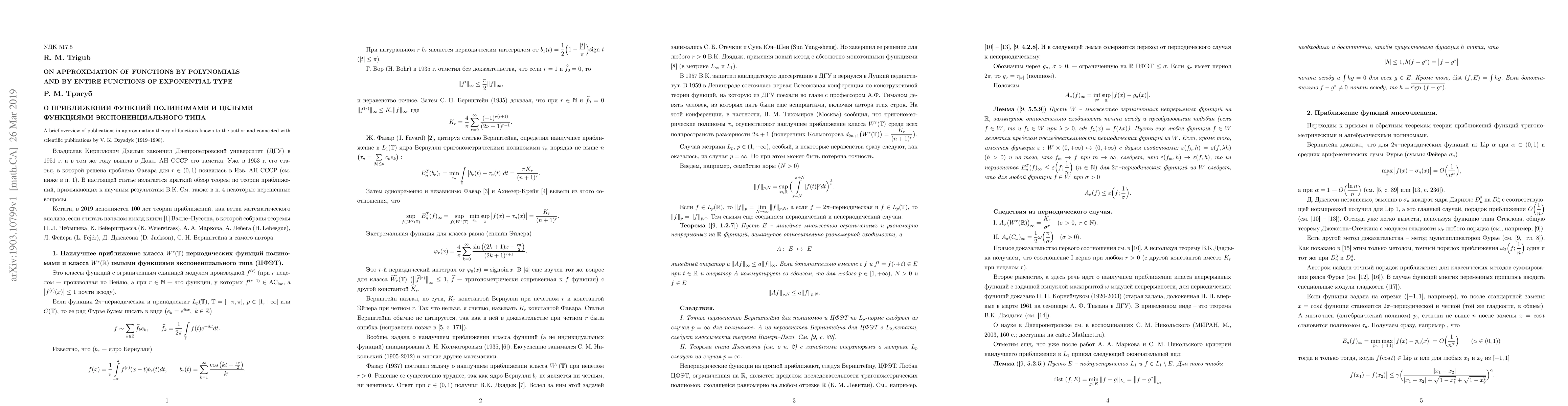 This paper discusses how to approximate functions using polynomials and entire functions of exponential type, with a focus on the key findings and implications related to V.~K.~Dzyadyk's scientific publications.