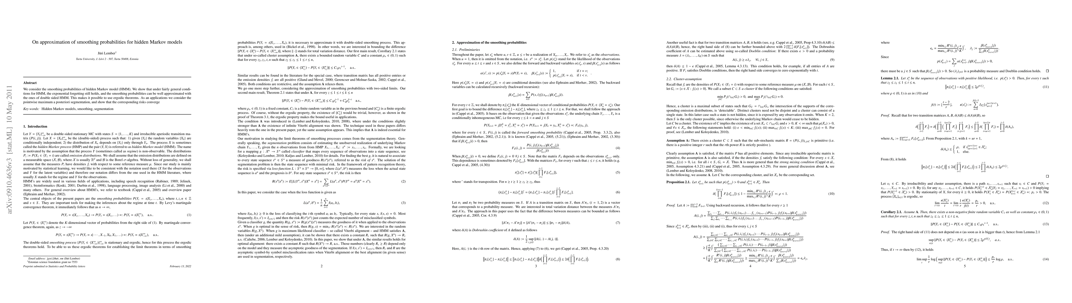 We consider the smoothing probabilities of hidden Markov model (HMM). We show that under fairly general conditions for HMM, the exponential forgetting still holds, and the smoothing probabilities can be well approximated with the ones of double sided HMM. This makes it possible to use ergodic theorems. As an applications we consider the pointwise maximum a posteriori segmentation, and show that the corresponding risks converge.