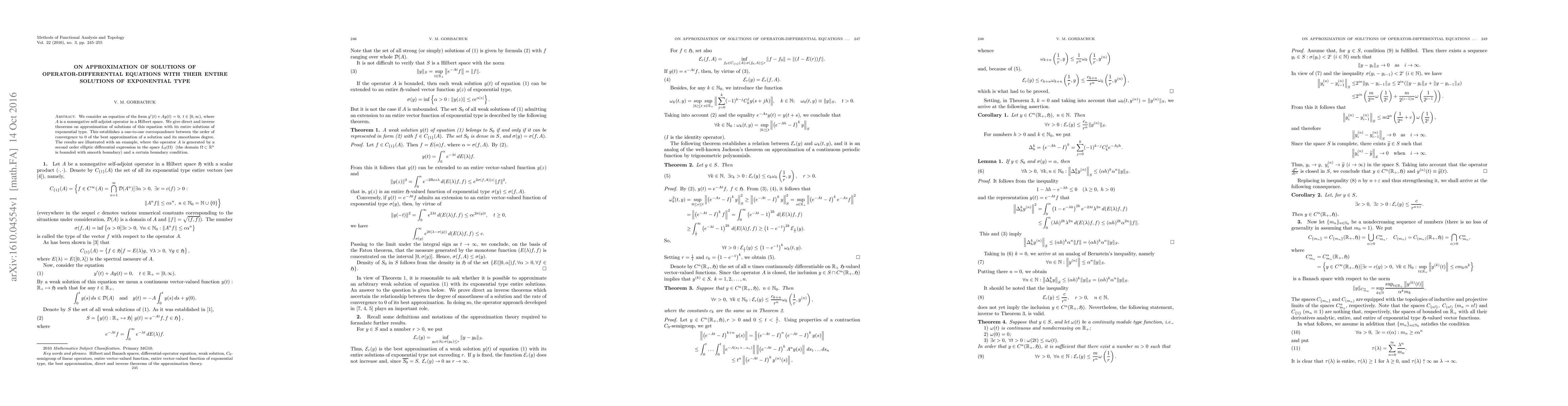 This paper explores the approximation of solutions to the operator-differential equation $y'(t) + Ay(t) = 0$ using entire solutions of exponential type, establishing direct and inverse theorems that link the convergence rate to the smoothness degree of the solutions. An example involving a second-order elliptic differential operator in $L_{2}(\Omega)$ is provided to illustrate these results.