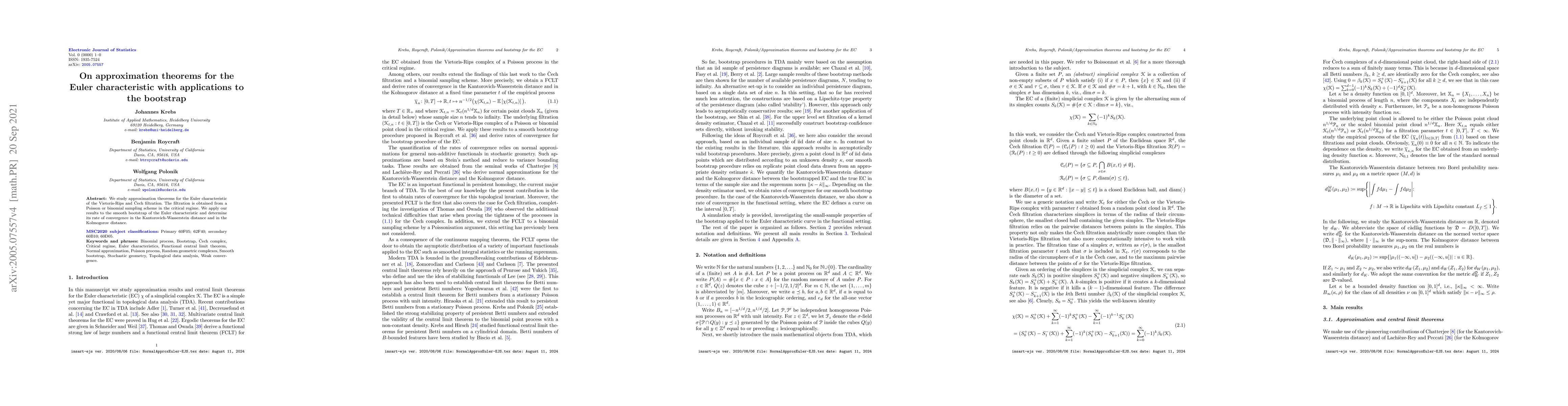 We study approximation theorems for the Euler characteristic of the Vietoris-Rips and Cech filtration. The filtration is obtained from a Poisson or binomial sampling scheme in the critical regime. We apply our results to the smooth bootstrap of the Euler characteristic and determine its rate of convergence in the Kantorovich-Wasserstein distance and in the Kolmogorov distance.