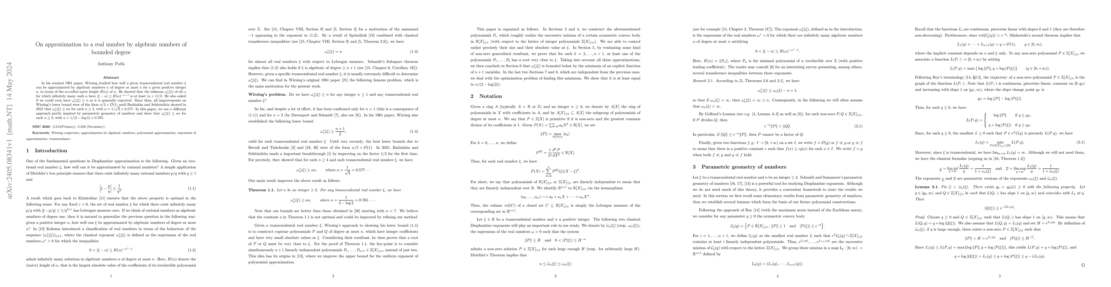 In his seminal 1961 paper, Wirsing studied how well a given transcendental real number $\xi$ can be approximated by algebraic numbers $\alpha$ of degree at most $n$ for a given positive integer $n$, in terms of the so-called naive height $H(\alpha)$ of $\alpha$. He showed that the infimum $\omega^*_n(\xi)$ of all $\omega$ for which infinitely many such $\alpha$ have $|\xi-\alpha| \le H(\alpha)^{-\omega-1}$ is at least $(n+1)/2$. He also asked if we could even have $\omega^*_n(\xi) \ge n$ as it is generally expected. Since then, all improvements on Wirsing's lower bound were of the form $n/2+\mathcal{O}(1)$ until Badziahin and Schleischitz showed in 2021 that $\omega^*_n(\xi) \ge an$ for each $n\ge 4$, with $a=1/\sqrt{3}\simeq 0.577$. In this paper, we use a different approach partly inspired by parametric geometry of numbers and show that $\omega^*_n(\xi) \ge an$ for each $n\ge 2$, with $a=1/(2-\log 2)\simeq 0.765$.