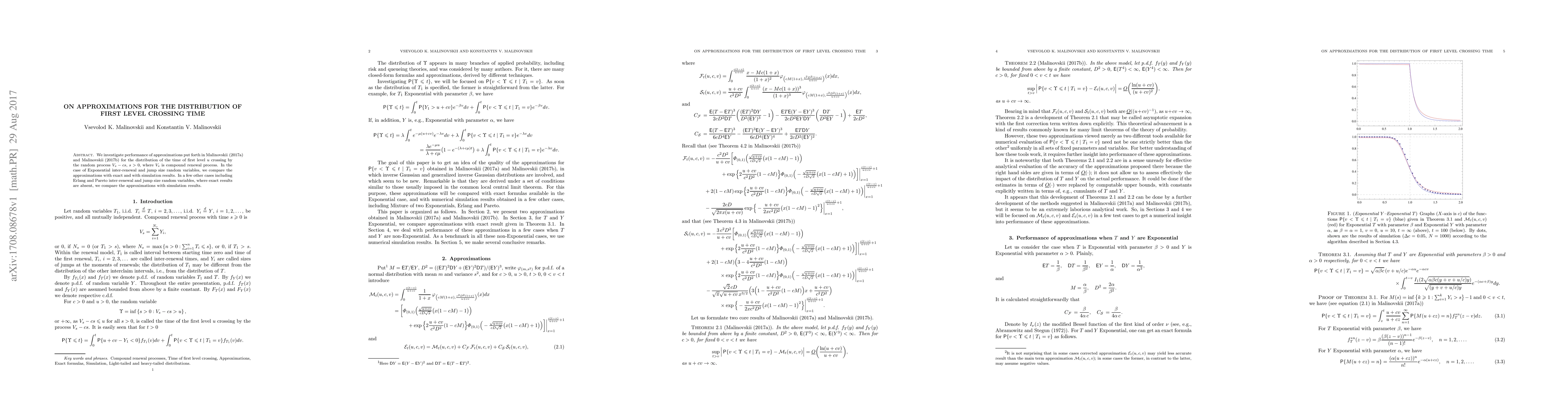 We investigate performance of approximations put forth in \citeNP{[Malinovskii 2017a]} and \citeNP{[Malinovskii 2017b]} for the distribution of the time of first level $u$ crossing by the random process $\homV{s}-cs$, $s>0$, where $\homV{s}$ is compound renewal process. In the case of Exponential inter-renewal and jump size random variables, we compare the approximations with exact and with simulation results. In a few other cases including Erlang and Pareto inter-renewal and jump size random variables, where exact results are absent, we compare the approximations with simulation results.