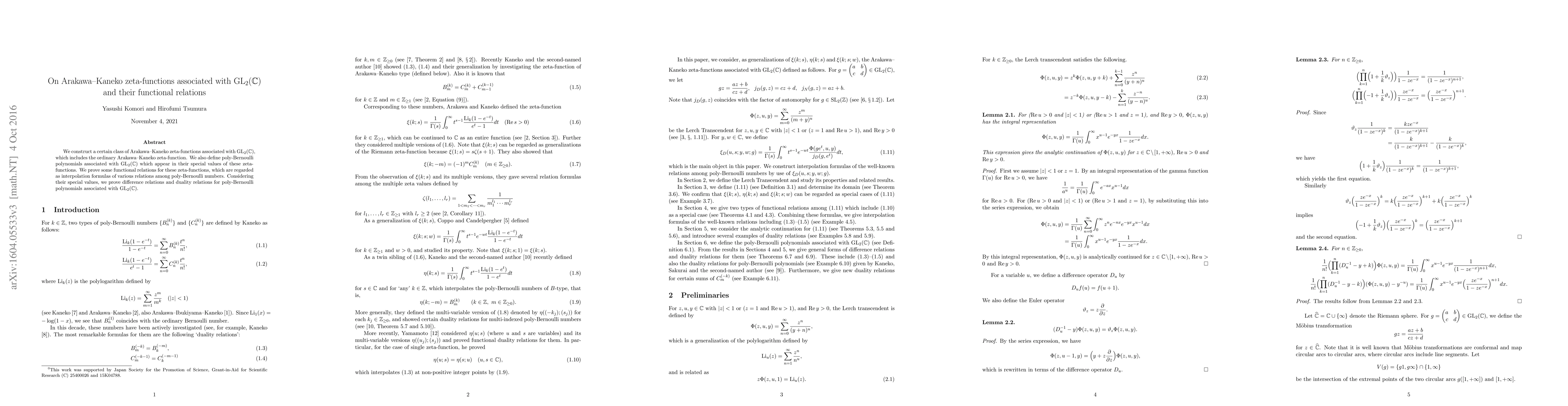 This paper constructs Arakawa-Kaneko zeta-functions linked to $GL_2(\mathbb{C})$ and proves their functional relations, serving as interpolation formulas for poly-Bernoulli numbers. It also introduces poly-Bernoulli polynomials associated with $GL_2(\mathbb{C})$ and establishes their difference and duality relations.