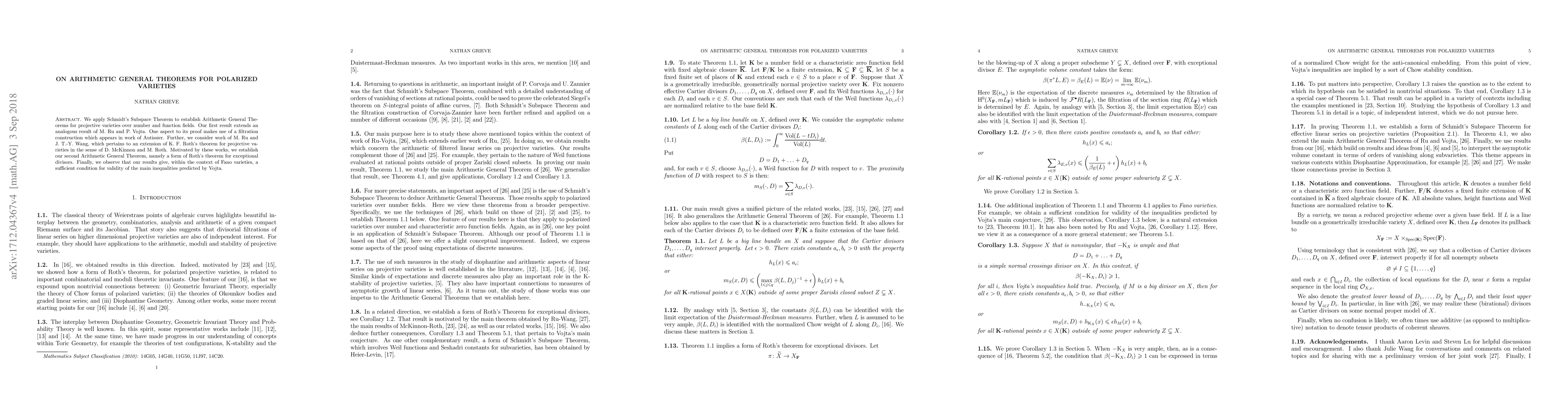 Researchers establish Arithmetic General Theorems for polarized varieties, extending previous work on projective varieties over number and function fields.