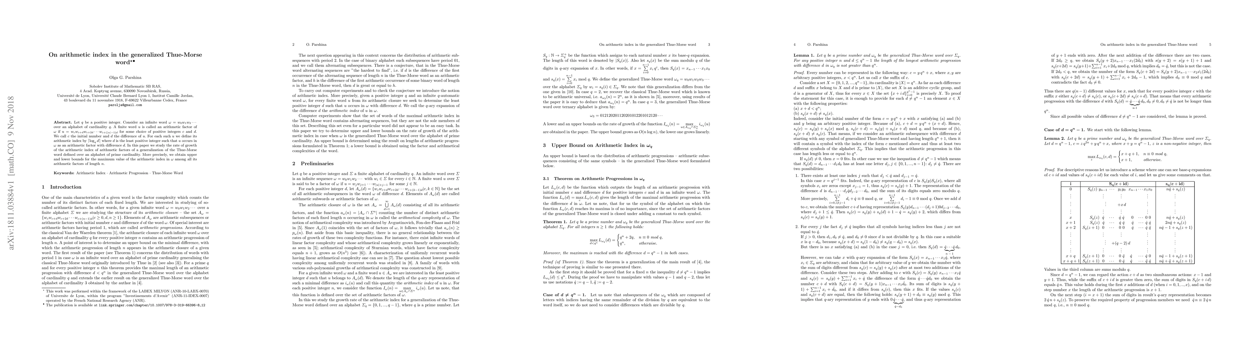 Let $q$ be a positive integer. Consider an infinite word $\omega=w_0w_1w_2\cdots$ over an alphabet of cardinality $q$. A finite word $u$ is called an arithmetic factor of $\omega$ if $u=w_cw_{c+d}w_{c+2d}\cdots w_{c+(|u|-1)d}$ for some choice of positive integers $c$ and $d$. We call $c$ the initial number and $d$ the difference of $u$. For each such $u$ we define its arithmetic index by $\lceil\log_q d\rceil$ where $d$ is the least positive integer such that $u$ occurs in $\omega$ as an arithmetic factor with difference $d$. In this paper we study the rate of growth of the arithmetic index of arithmetic factors of a generalization of the Thue-Morse word defined over an alphabet of prime cardinality. More precisely, we obtain upper and lower bounds for the maximum value of the arithmetic index in $\omega$ among all its arithmetic factors of length $n$.