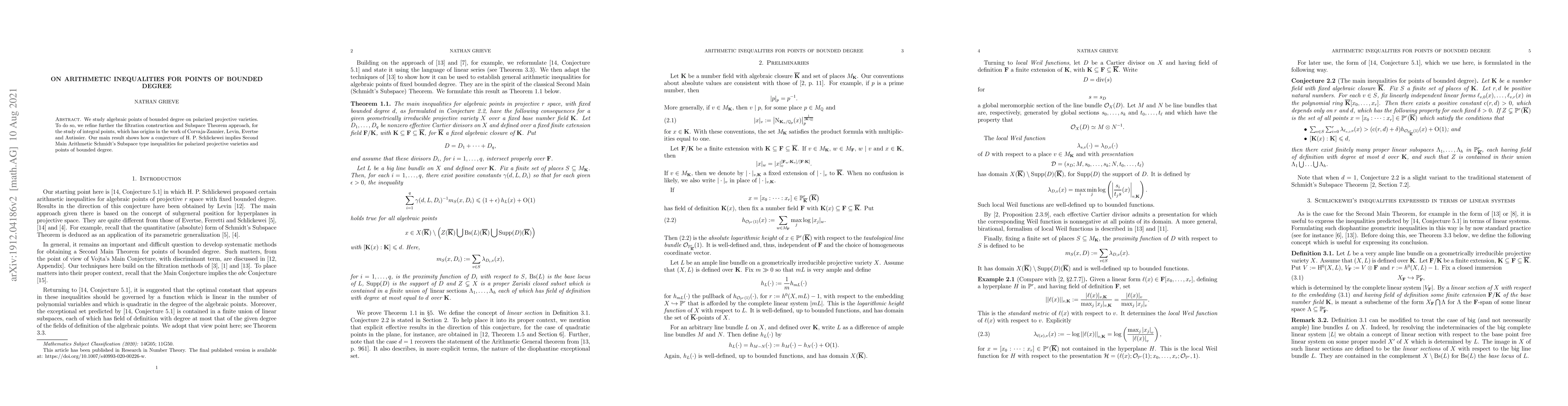 This paper refines filtration constructions and Subspace Theorem techniques to study algebraic points of bounded degree on polarized projective varieties, ultimately proving that a conjecture of H. P. Schlickewei implies Second Main Arithmetic Schmidt's Subspace type inequalities for such points.