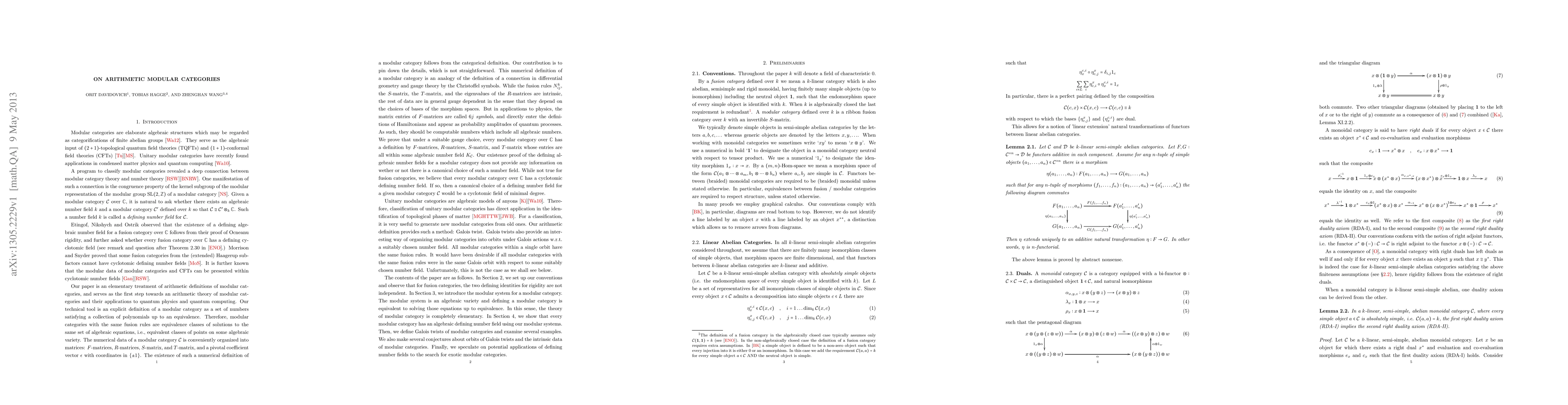 This paper defines modular categories over fields of characteristic 0 through solutions to polynomial equations, showing that these solutions contain algebraic numbers. It aims to classify modular categories arithmetically and supports computational tools for classification.