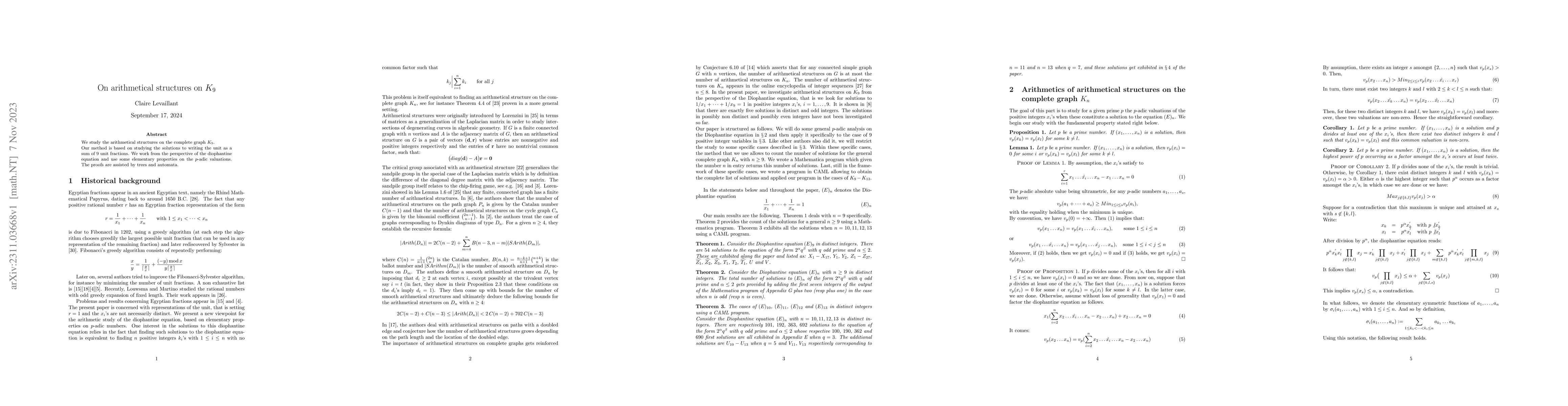 This paper investigates arithmetical structures on the complete graph $K_9$ by exploring solutions to expressing the unit as a sum of nine unit fractions, employing Diophantine equations and $p$-adic valuations, with proofs supported by trees and automata.