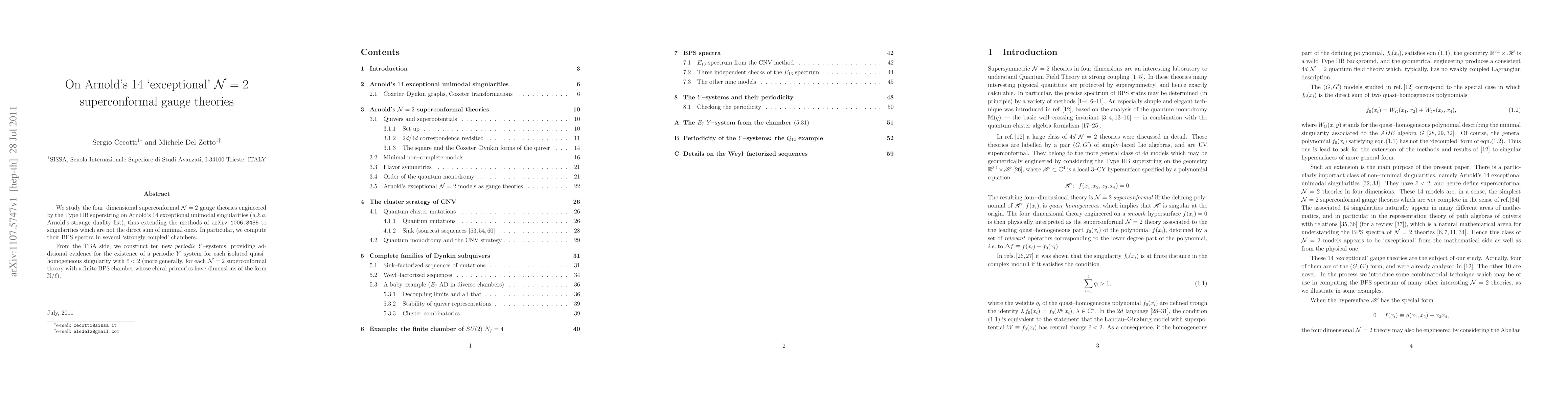 We study the four-dimensional superconformal N=2 gauge theories engineered by the Type IIB superstring on Arnold's 14 exceptional unimodal singularities (a.k.a. Arnold's strange duality list), thus extending the methods of 1006.3435 to singularities which are not the direct sum of minimal ones. In particular, we compute their BPS spectra in several `strongly coupled' chambers. From the TBA side, we construct ten new periodic Y-systems, providing additional evidence for the existence of a periodic Y-system for each isolated quasi-homogeneous singularity with $\hat c<2$ (more generally, for each N=2 superconformal theory with a finite BPS chamber whose chiral primaries have dimensions of the form N/l).