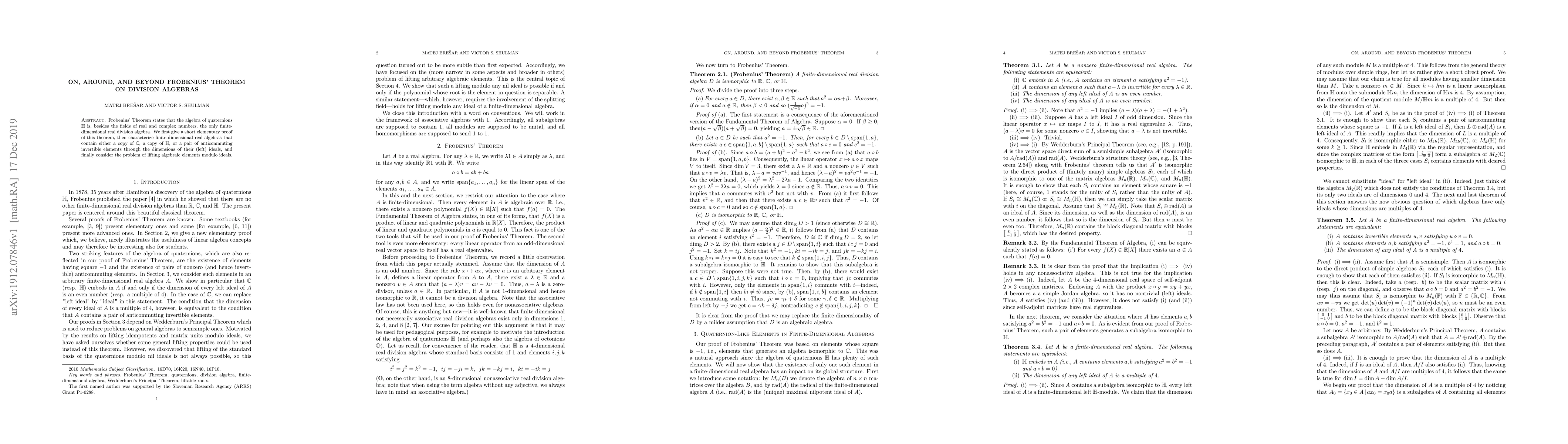 Summary: This paper provides an elementary proof of Frobenius' Theorem on real division algebras, characterizes finite-dimensional real algebras containing specific structures, and explores the lifting of algebraic elements modulo ideals.