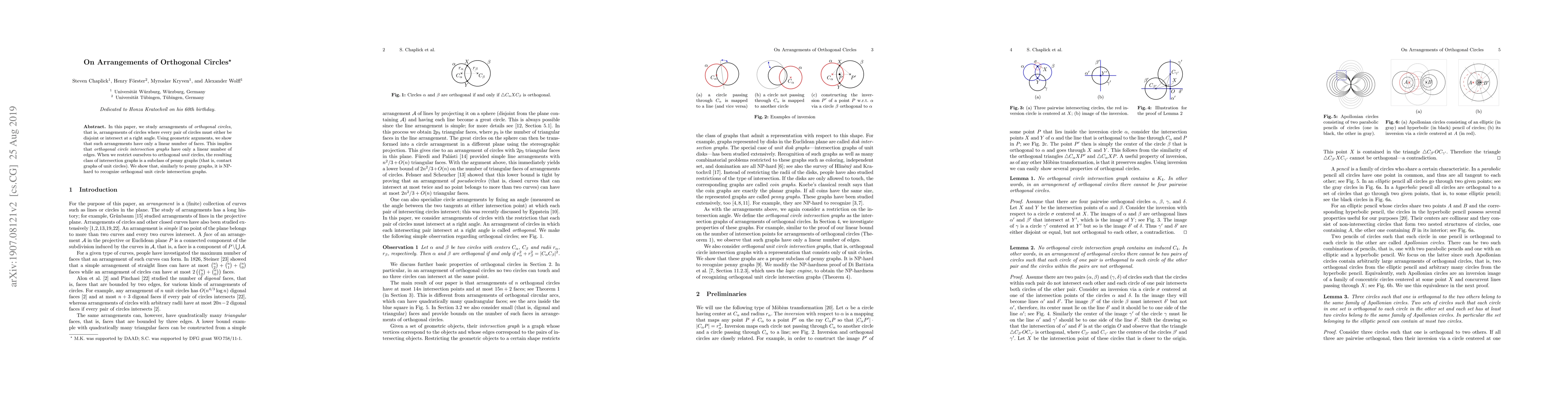 This paper investigates arrangements of orthogonal circles, proving that these configurations produce only a linear number of faces, thus yielding a linear number of edges for orthogonal circle intersection graphs. It also establishes the NP-hardness of recognizing intersection graphs formed by orthogonal unit circles, linking them to a subclass of penny graphs.