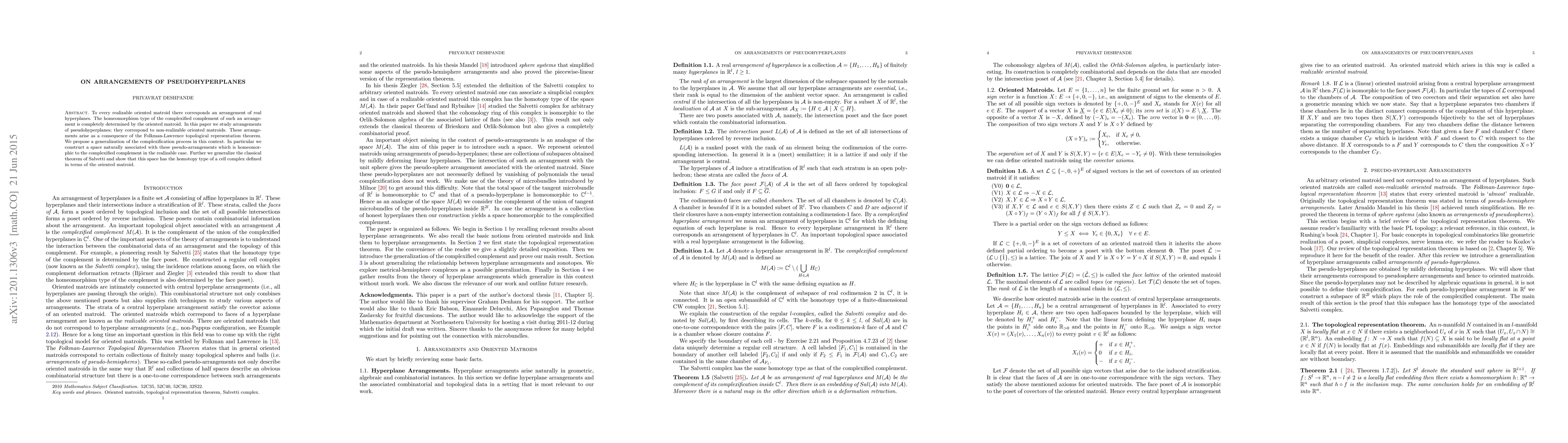 To every realizable oriented matroid there corresponds an arrangement of real hyperplanes. The homeomorphism type of the complexified complement of such an arrangement is completely determined by the oriented matroid. In this paper we study arrangements of pseudohyperplanes; they correspond to non-realizable oriented matroids. These arrangements arise as a consequence of the Folkman-Lawrence topological representation theorem. We propose a generalization of the complexification process in this context. In particular we construct a space naturally associated with these pseudo-arrangements which is homeomorphic to the complexified complement in the realizable case. Further we generalize the classical theorem of Salvetti and show that this space has the homotopy type of a cell complex defined in terms of the oriented matroid.