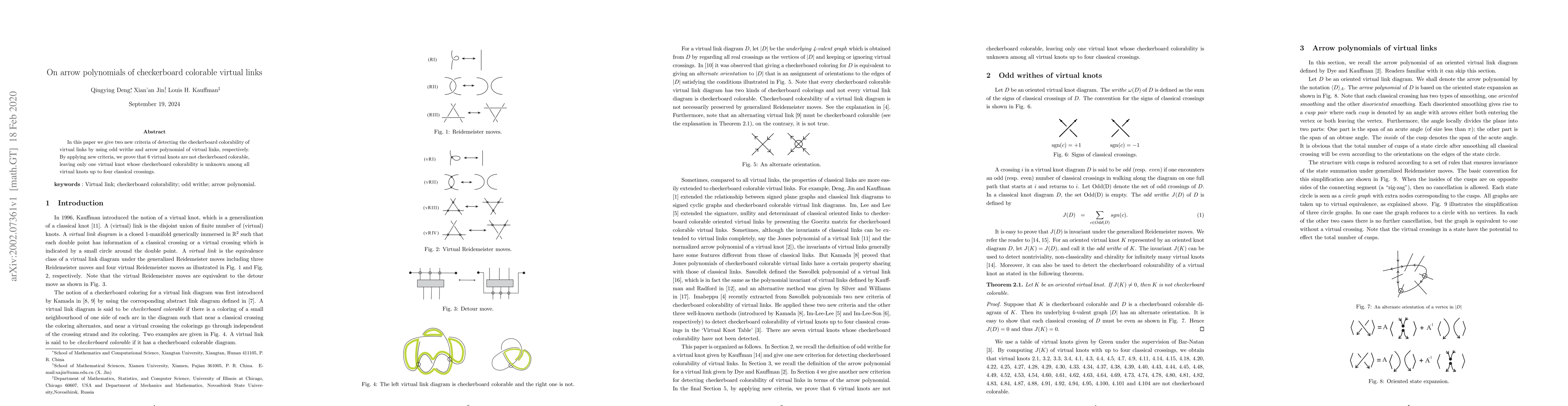 This paper introduces new criteria for determining the checkerboard colorability of virtual links using odd writhe and arrow polynomials. It concludes that six virtual knots are non-colorable, leaving only one virtual knot with unknown checkerboard colorability among those with up to four crossings.