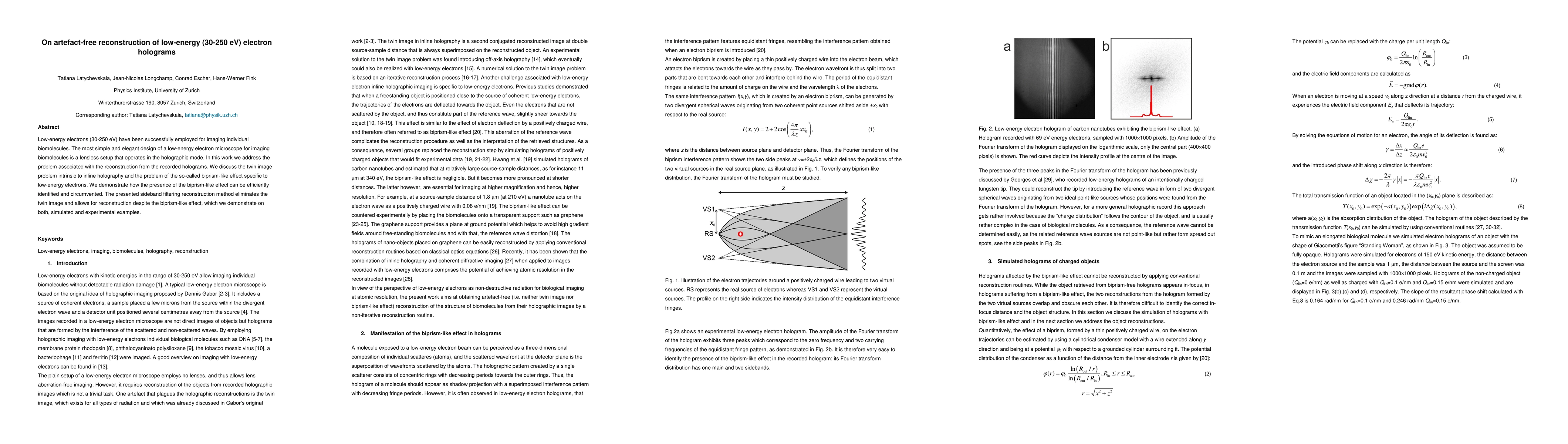 Low-energy electrons (30-250 eV) have been successfully employed for imaging individual biomolecules. The most simple and elegant design of a low-energy electron microscope for imaging biomolecules is a lensless setup that operates in the holographic mode. In this work we address the problem associated with the reconstruction from the recorded holograms. We discuss the twin image problem intrinsic to inline holography and the problem of the so-called biprism-like effect specific to low-energy electrons. We demonstrate how the presence of the biprism-like effect can be efficiently identified and circumvented. The presented sideband filtering reconstruction method eliminates the twin image and allows for reconstruction despite the biprism-like effect, which we demonstrate on both, simulated and experimental examples.