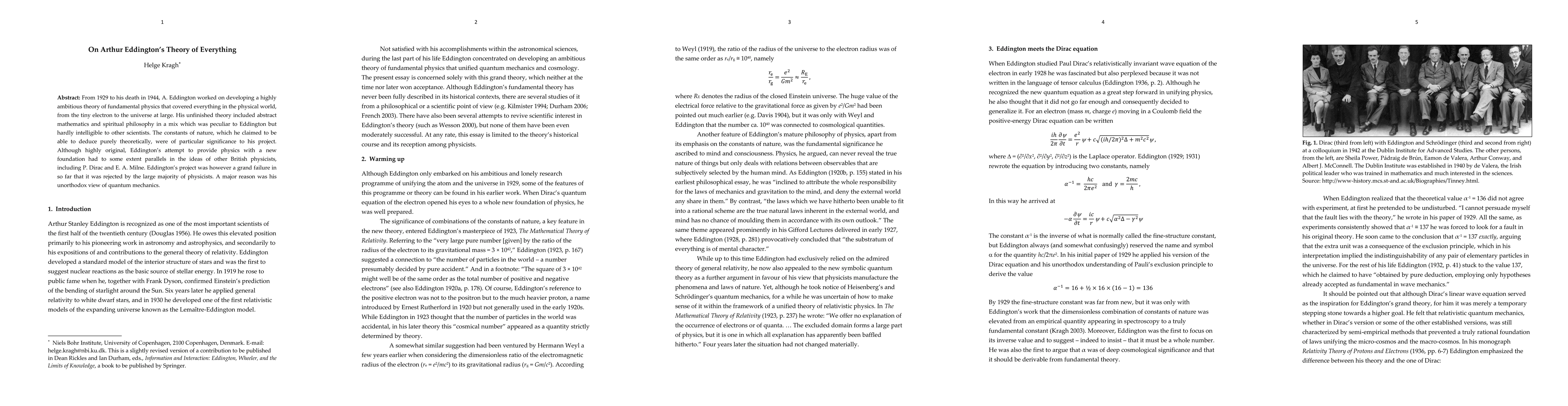 From 1929 to his death in 1944, A. Eddington worked on developing a highly ambitious theory of fundamental physics that covered everything in the physical world, from the tiny electron to the universe at large. His unfinished theory included abstract mathematics and spiritual philosophy in a mix which was peculiar to Eddington but hardly intelligible to other scientists. The constants of nature, which he claimed to be able to deduce purely theoretically, were of particular significance to his project. Although highly original, Eddington's attempt to provide physics with a new foundation had to some extent parallels in the ideas of other British physicists, including P. Dirac and E. A. Milne. Eddington's project was however a grand failure in so far that it was rejected by the large majority of physicists. A major reason was his unorthodox view of quantum mechanics.
