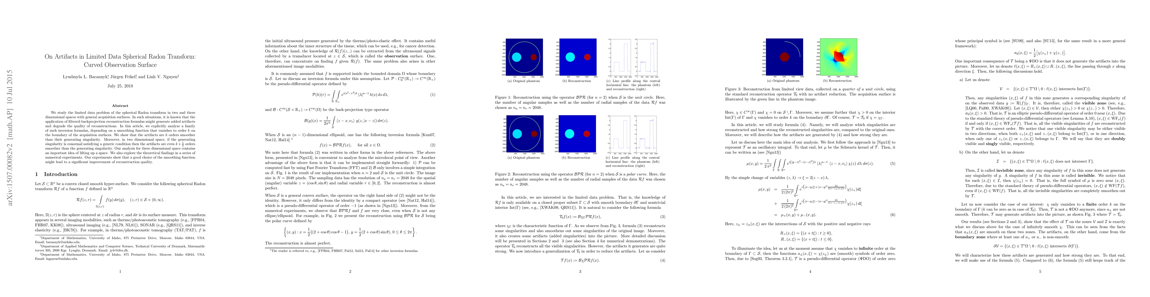 In this article, we consider the limited data problem for spherical mean transform. We characterize the generation and strength of the artifacts in a reconstruction formula. In contrast to the third's author work [Ngu15b], the observation surface considered in this article is not flat. Our results are comparable to those obtained in [Ngu15b] for flat observation surface. For the two dimensional problem, we show that the artifacts are $k$ orders smoother than the original singularities, where $k$ is vanishing order of the smoothing function. Moreover, if the original singularity is conormal, then the artifacts are $k+\frac{1}{2}$ order smoother than the original singularity. We provide some numerical examples and discuss how the smoothing effects the artifacts visually. For three dimensional case, although the result is similar to that [Ngu15b], the proof is significantly different. We introduce a new idea of lifting the space.