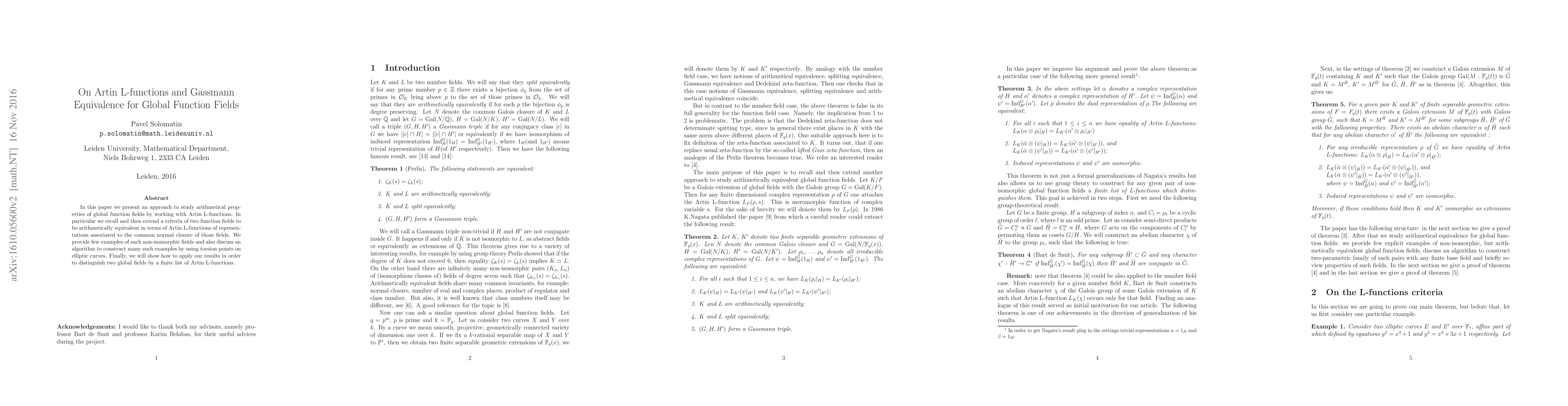 This paper explores the arithmetical properties of global function fields through Artin L-functions, extending criteria for arithmetical equivalence based on associated representations. It also presents examples and an algorithm for constructing non-isomorphic fields using torsion points on elliptic curves, and demonstrates how to distinguish global fields using a finite list of Artin L-functions.