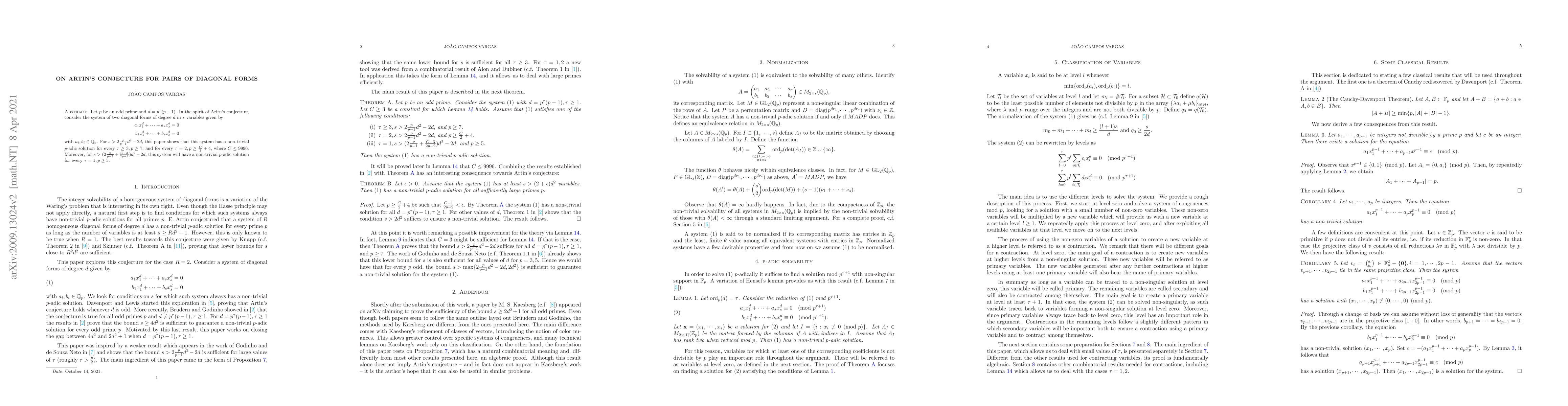 Let $p$ be an odd prime and $d = p^{\tau}(p-1)$. In the spirit of Aritn's conjecture, consider the system of two diagonal forms of degree $d$ in $s$ variables given by \begin{equation*}\begin{split} a_1x_1^d + \cdots + a_sx_s^d = 0\\ b_1x_1^d + \cdots + b_sx_s^d = 0 \end{split} \end{equation*} with $a_i, b_i \in \mathbb{Q}_p$. For $s > 2 \frac{p}{p-1}d^2 - 2d$, this paper shows that this system has a non-trivial $p$-adic solution for every $\tau \ge 3, p \ge 7$, and for every $\tau = 2, p \ge \frac{C}{2}+4$, where $C \le 9996$. Moreover, for $s > (2\frac{p}{p-1} + \frac{C-3}{2p-2})d^2 - 2d$, this system will have a non-trivial $p$-adic solution for every $\tau = 1, p \ge 5$.